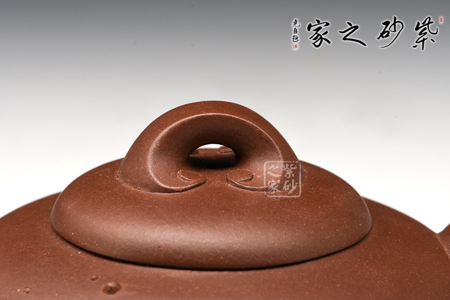 這款“紫氣東來”,以名字就可知此作的非凡大氣。圓扁的壺身,壺腹豐腴;壓蓋微鼓起,其上拱形鈕設計,新穎別致,細節(jié)把握到位;彎嘴耳形把,壺嘴端口稍平,出、斷水利落,把握方便。