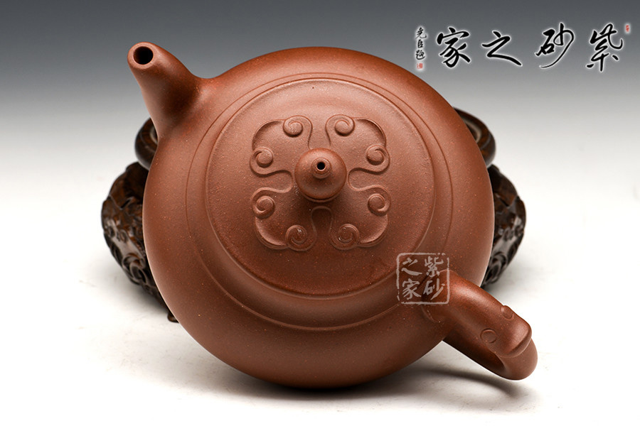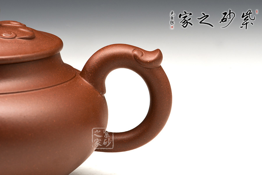 此壺扁圓腹,短彎流,環(huán)狀柄,端部呈飛云之勢(shì),端拿方便,審美性佳。蓋面飾以如意紋,與圓珠形鈕相呼應(yīng),于傳統(tǒng)造型中見(jiàn)新意。