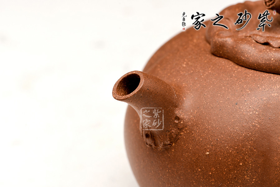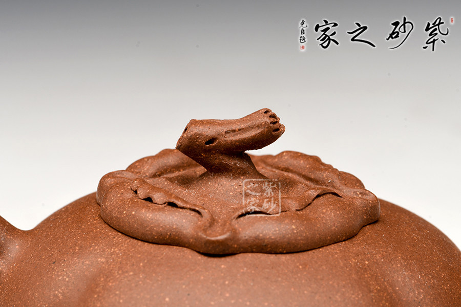 以柿蒂為蓋鈕,壺身還原了柿子本身圓潤飽滿的形態(tài),又因老師的高品質(zhì)用泥而更顯細(xì)膩圓滿。整器渾然一體,形態(tài)逼真,巧妙生動。