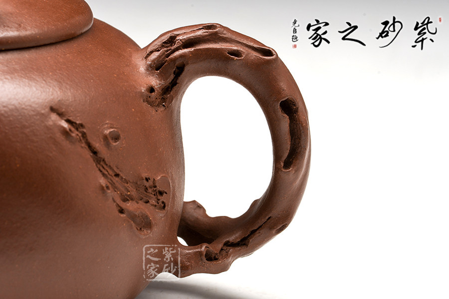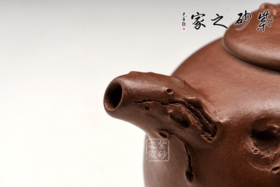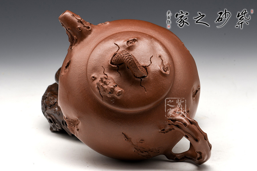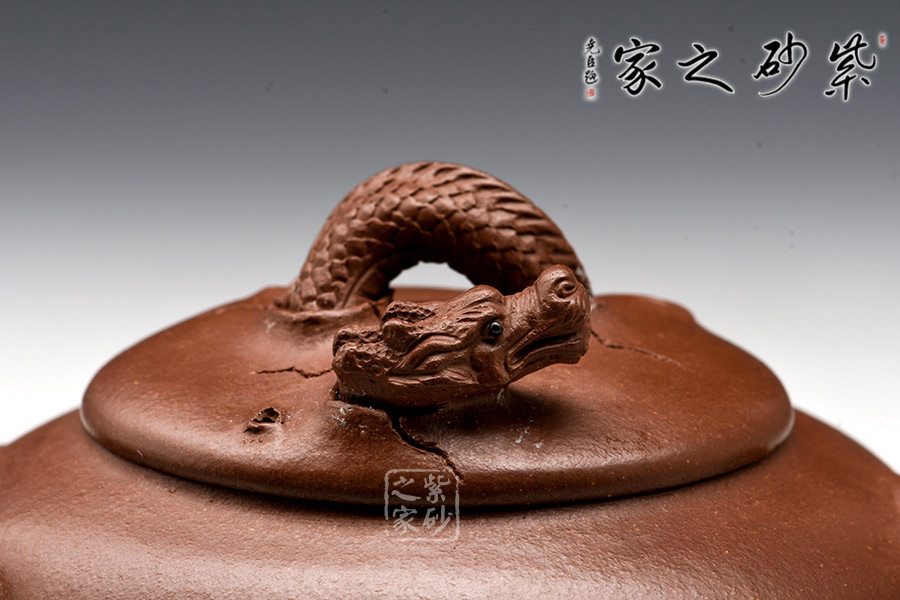 耳形把下壓,若虬枝彎成;胥出彎流,水流爽利;壓蓋緊密貼合,氣密性良好;壺鈕為破土而出的龍頭身,須眥清晰,威嚴(yán)無(wú)二,極具氣勢(shì),生命氣息撲面而來(lái)。