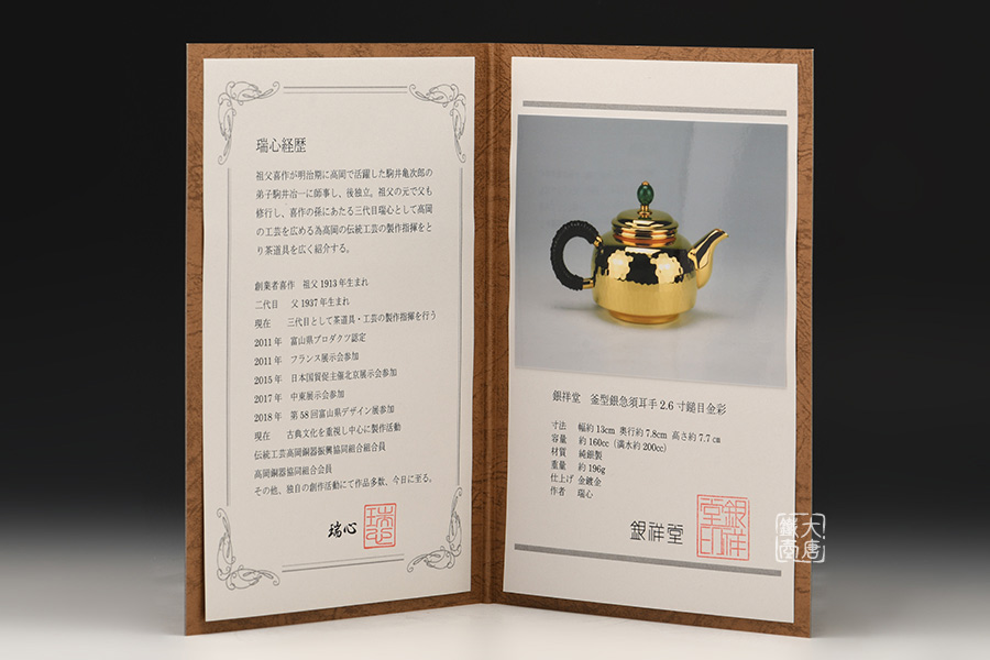 銀祥堂,誕生于工藝之鄉的匠人世家。銀祥堂堂主瑞心的祖父,是一位佛具匠人。師從于明治時期活躍在高岡的名人駒井龜次郎的弟子駒井冶一,后與金箔匠人兒子,瑞心的父親一起創建了佛具工房。在不斷擴大工房規模影響的同時,大力普及推廣高岡的銅器,香爐及茶具。其祖父與多位著名藝術家關系甚密。曾是已故日展(日本最高級別藝術展)理事大角勲先生的金工資助人。