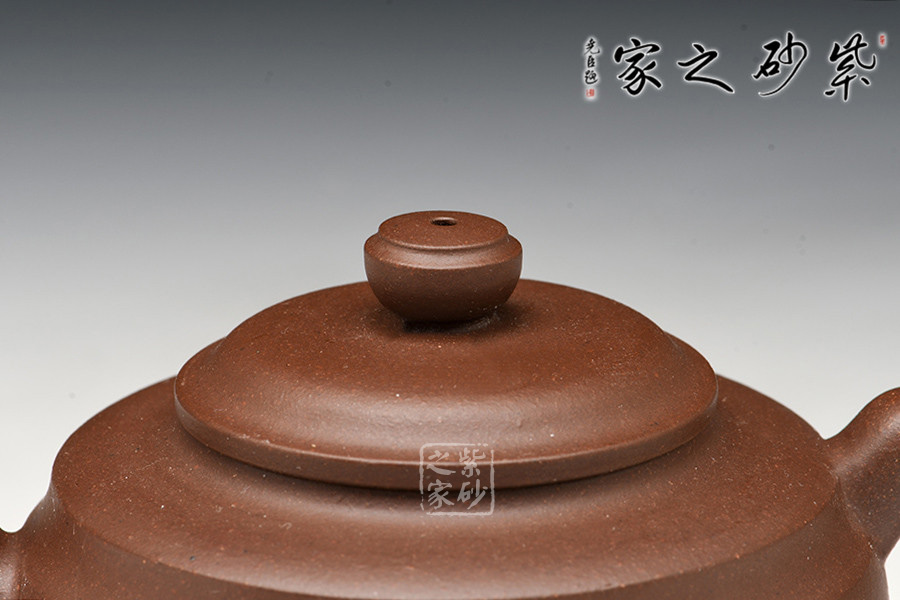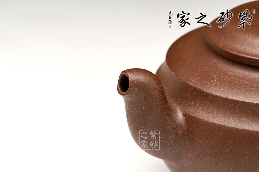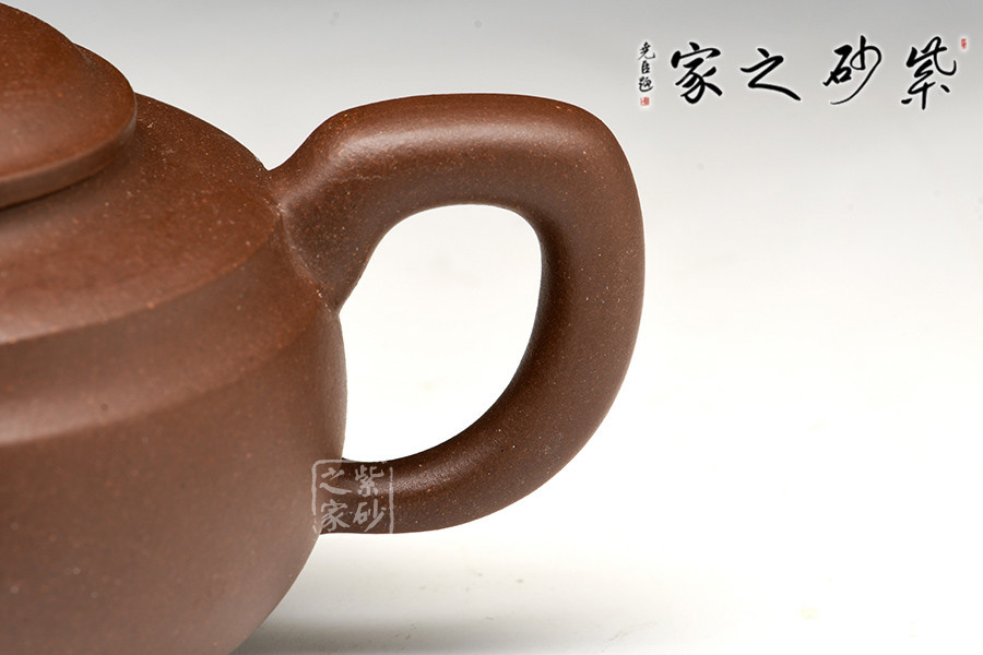 此作整體為扁圓的壺身,圓潤豐腴,與其他傳統的壺體對比有所亮點,主要展現在壺肩處的凹線處理,雙線環繞,更具層次美感。壓蓋之上的柱形鈕也是構造和諧的體現,與壺身形呼應。還有短彎的流嘴自然胥出,耳形端把更有細節上的設計之妙,端拿更為方便舒適。