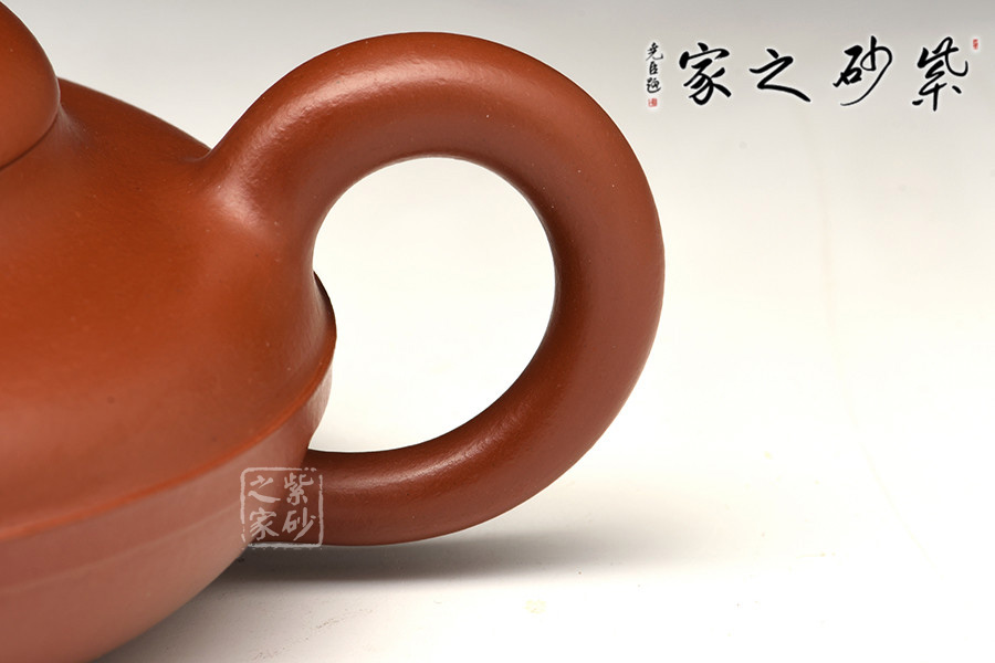 壺身用兩泥片合制作成扁球狀,口部與半球狀蓋相切,壺底簡潔,為一捺底。橋梁鈕與蓋渾然一體,整個壺在扁圓中求韻味。流自壺腹胥伸自然,把高挑圓潤下留垂耳,與流對應稱勢。中置一腰帶線將全壺提攜神韻,將制作泥痕藏于其中,達到天衣無縫。