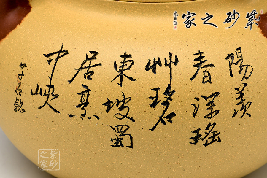 B面: 裝飾: 詩詞 裝飾者:嚴(yán)志軍(子石) 裝飾內(nèi)容: “陽羨春深瑤竹碧,東坡蜀居烹中峽”