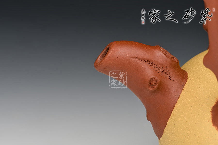 泥性:感甜嫩綿密,質(zhì)堅而溫潤,呈近田黃色調(diào),為江蘇宜興趙莊山系朱泥礦~黃石黃之共生礦,經(jīng)挑揀練製而成,因含鐵量只達(dá)6%左右,致陶之后呈“金田黃色”。