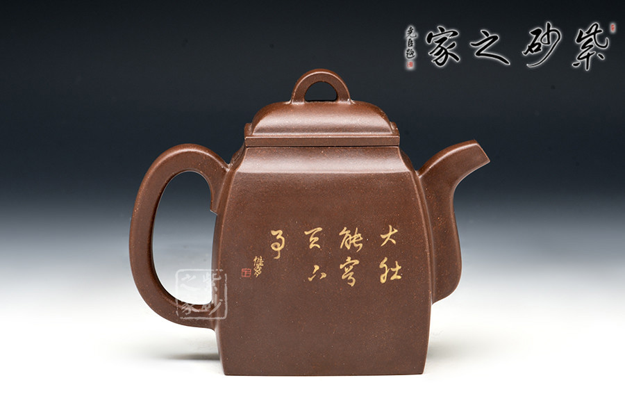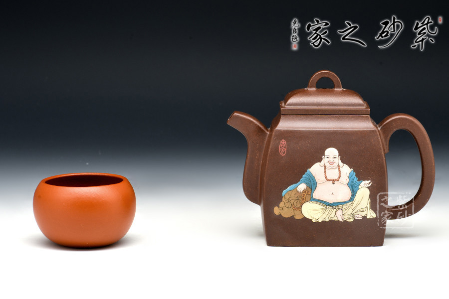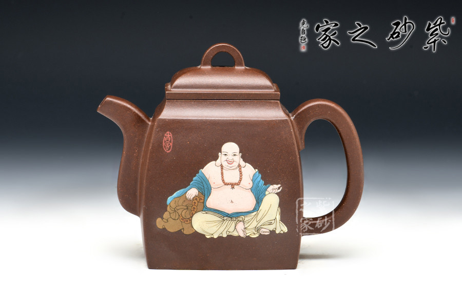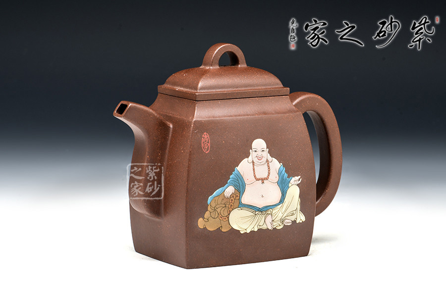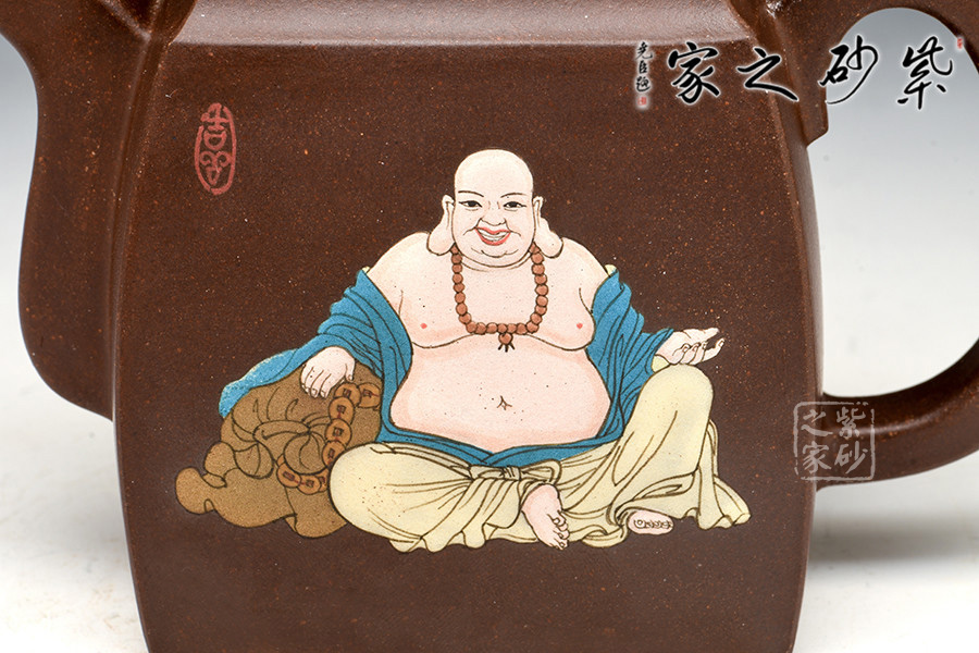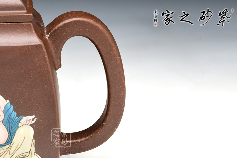 壺體造型簡潔洗練,方正得體,有漢代之風(fēng)韻。壺面泥繪裝飾書畫,風(fēng)神脫俗,觀之賞之奉之,領(lǐng)悟“禪語一點(diǎn)開心機(jī),無有煩惱上乘即。”