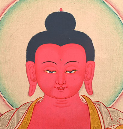| 唐卡“師傅”開臉,筆路穩重流暢。體現完美天人相,可見佛菩薩慈眉善目,賦予唐卡畫像生的靈氣。 | 細節決定品質,點睛之筆不到位影響整體美觀,五官比例不協調,面目呆板,缺乏靈氣。 |