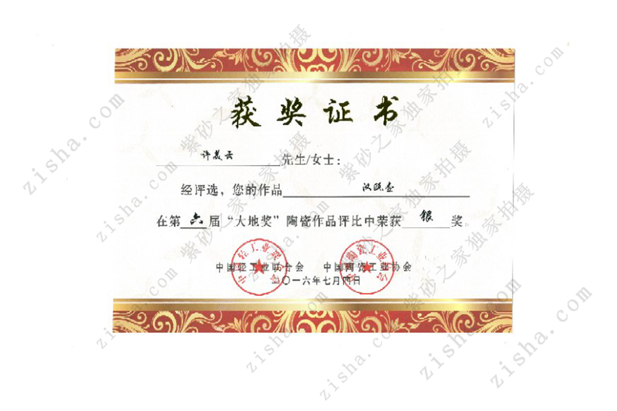 2016年“漢甌壺”獲第六屆大地獎陶瓷作品評比銀獎;