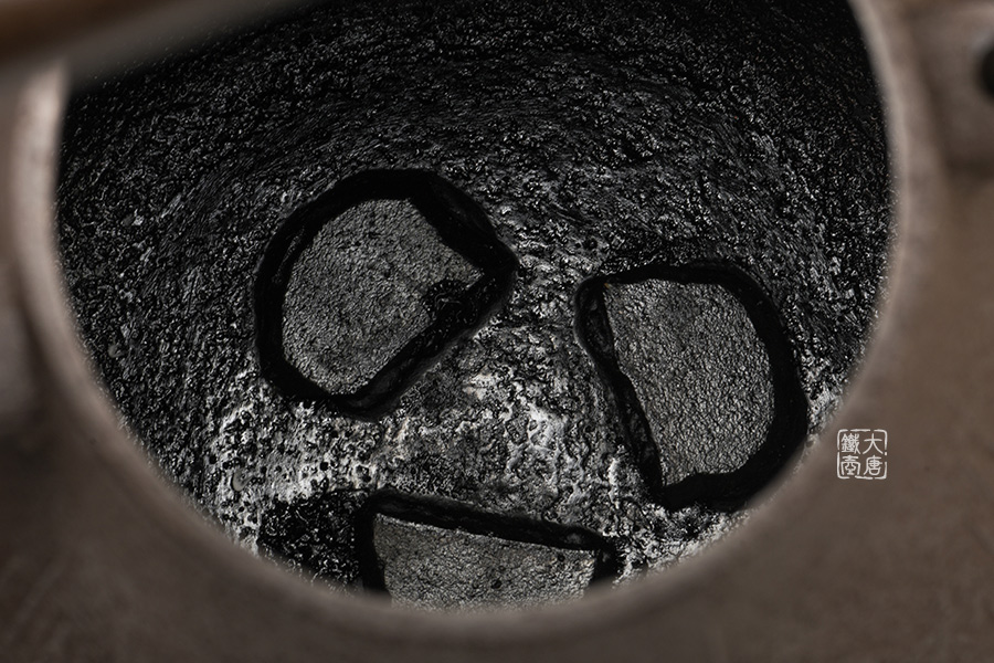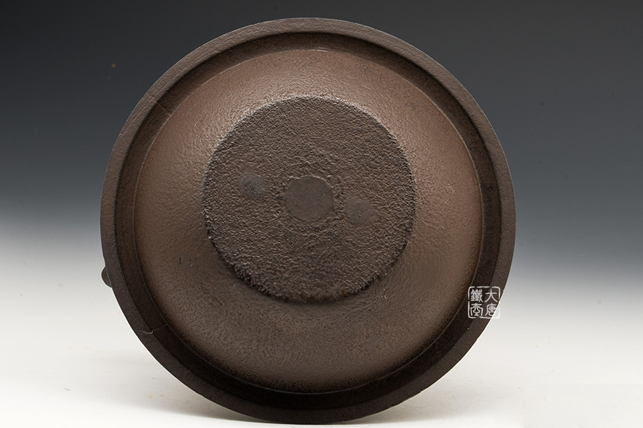 鐵瓶內底被稱之為“鳴金”的響片使得水燒開之后的煮沸聲更為悅耳。鐵瓶下側的“春齋”刻印以及共箱蓋子的題字都是作者親筆所寫。此為檢驗春齋鐵瓶真偽的標志之一。