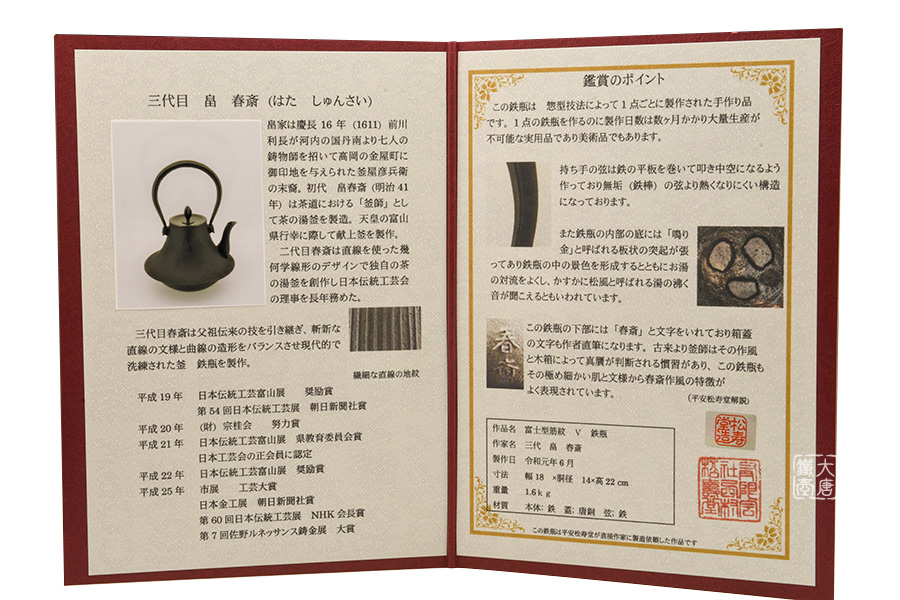 春齋的鐵瓶使用的都是1模1具的方法制作的純手工作品。與一般的量產品不同,通常制作這樣一個純手工作品,需要花費數月時間才能完成。因此在某種程度上可以說春齋的鐵瓶是兼具實用性的藝術品。