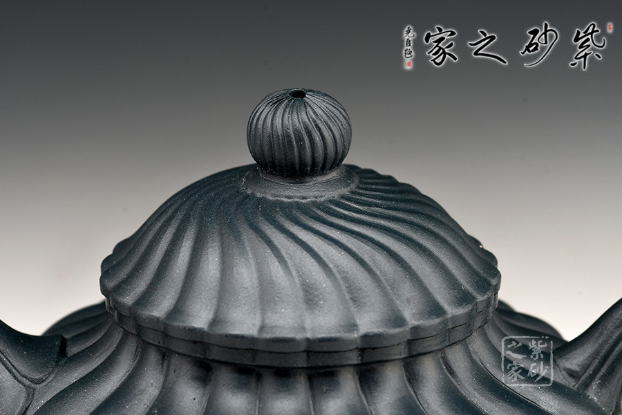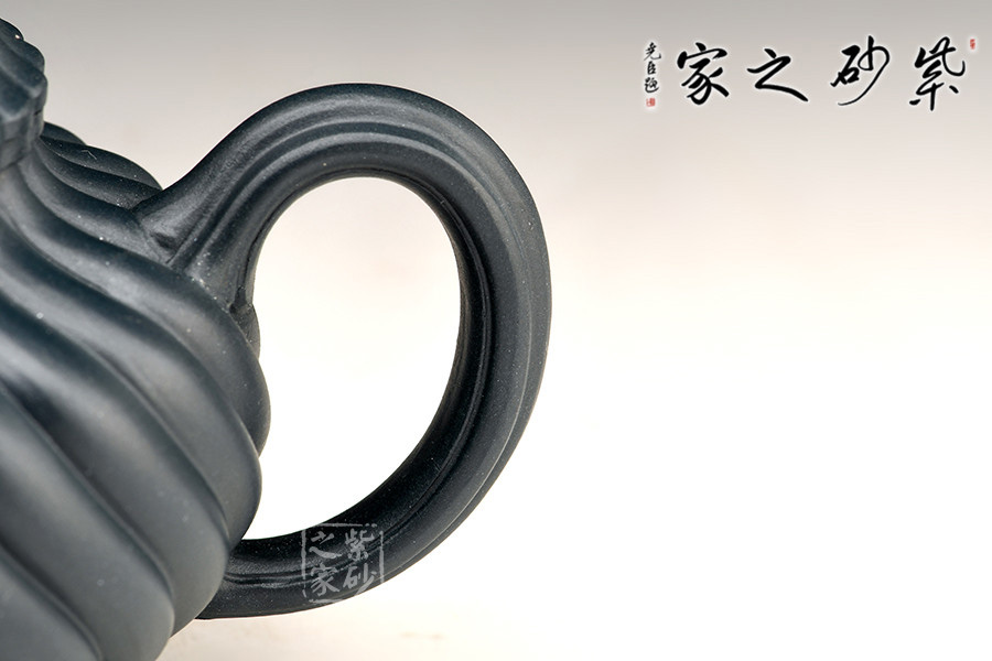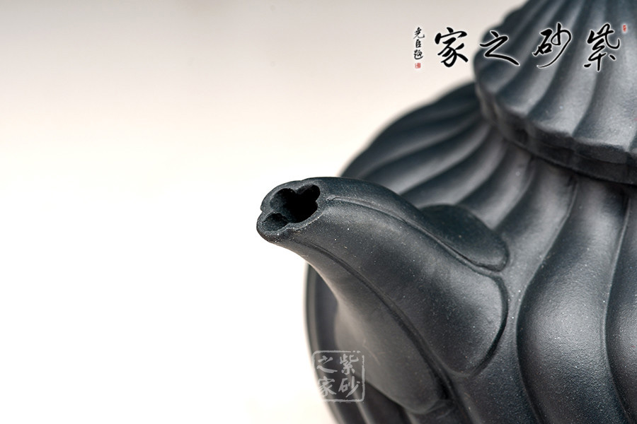 典型的筋紋器壺式,形制端莊,口、蓋、鈕與壺體紋理配合精確,呈流動(dòng)的筋紋動(dòng)感。一彎秀嘴在菊瓣中生展,貼切潤(rùn)韻,長(zhǎng)端把流若水,秀姿優(yōu)雅,身、蓋、鈕三者之權(quán)衡比例恰當(dāng),筋紋貫氣,如出一轍。