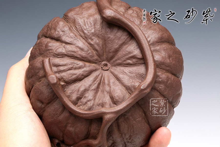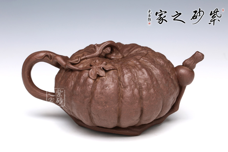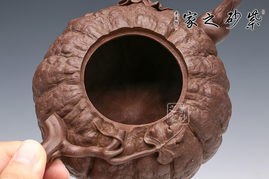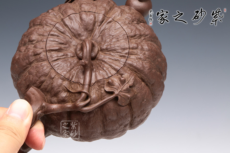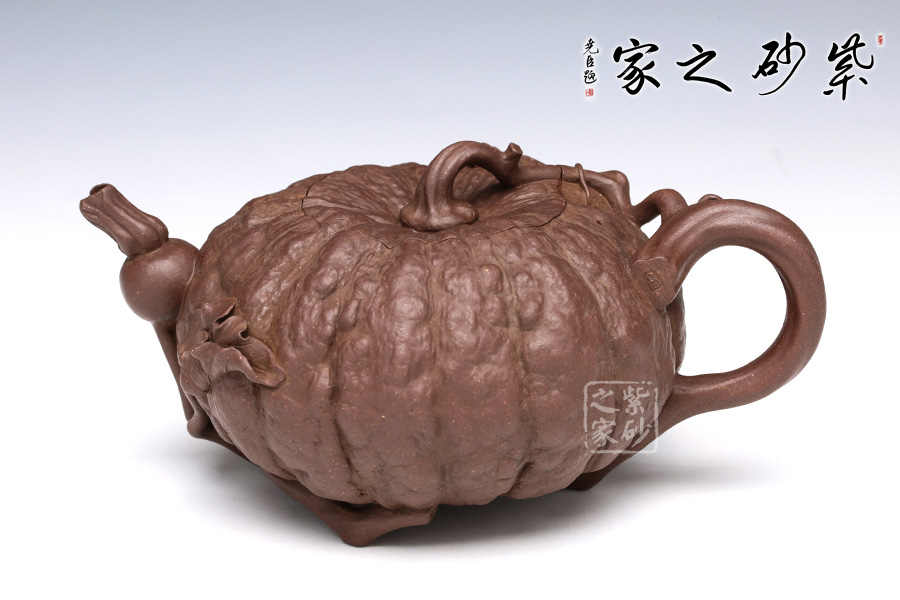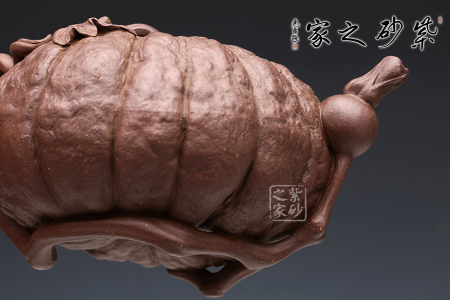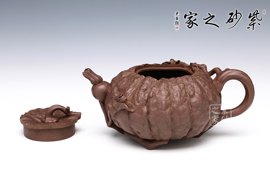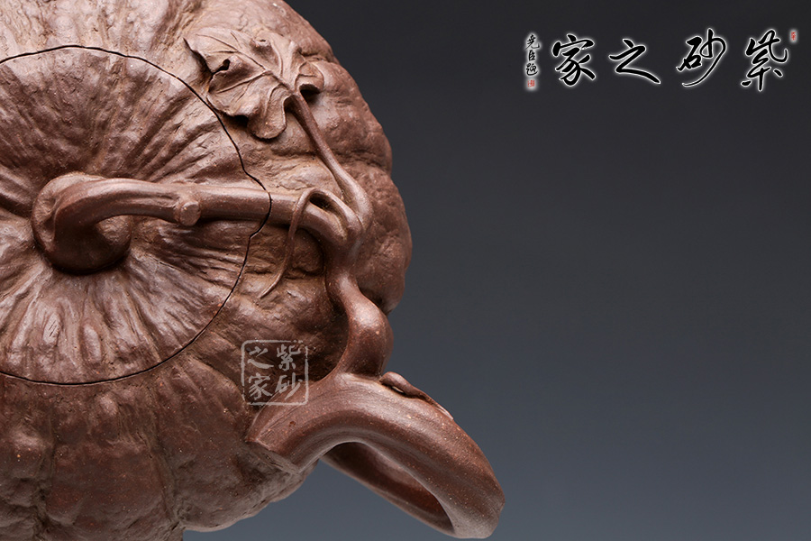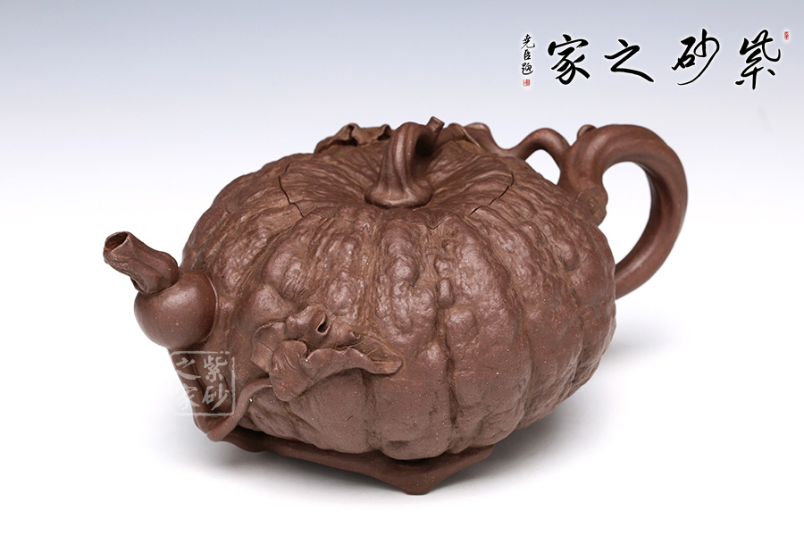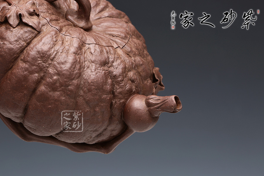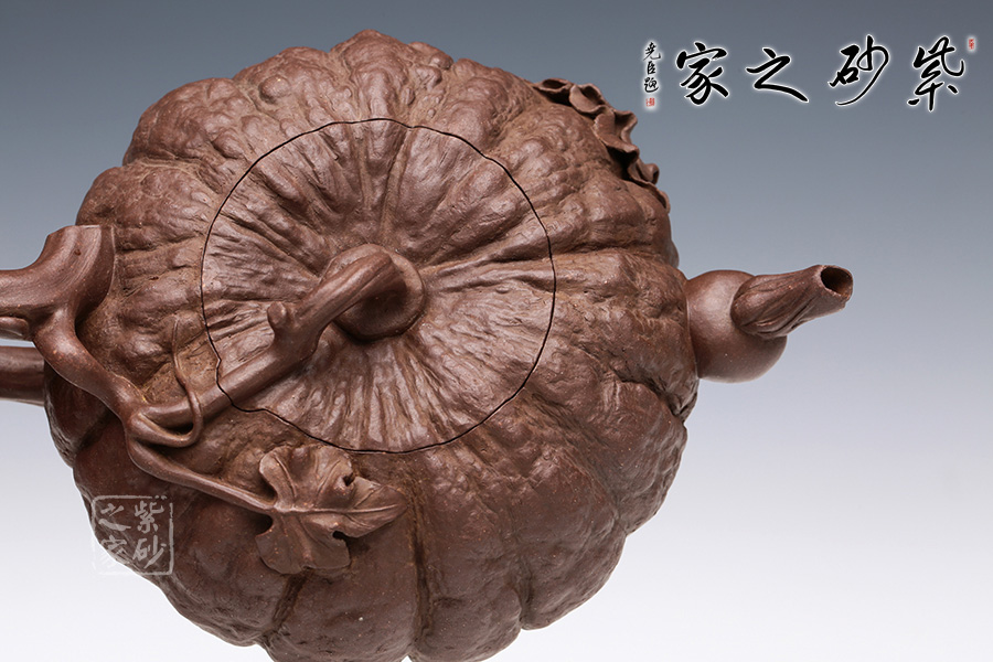 此南瓜不僅外形酷似南瓜,更是集聚了南瓜的神韻,猶若瓜熟即將待落。南瓜形壺體、蒂狀壺鈕、壺嘴則用新瓜小葉結(jié)合而成。壺把處一南瓜葉子胥出,栩栩如生。