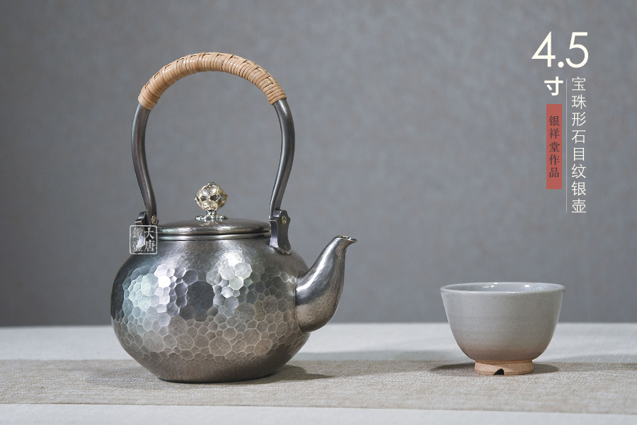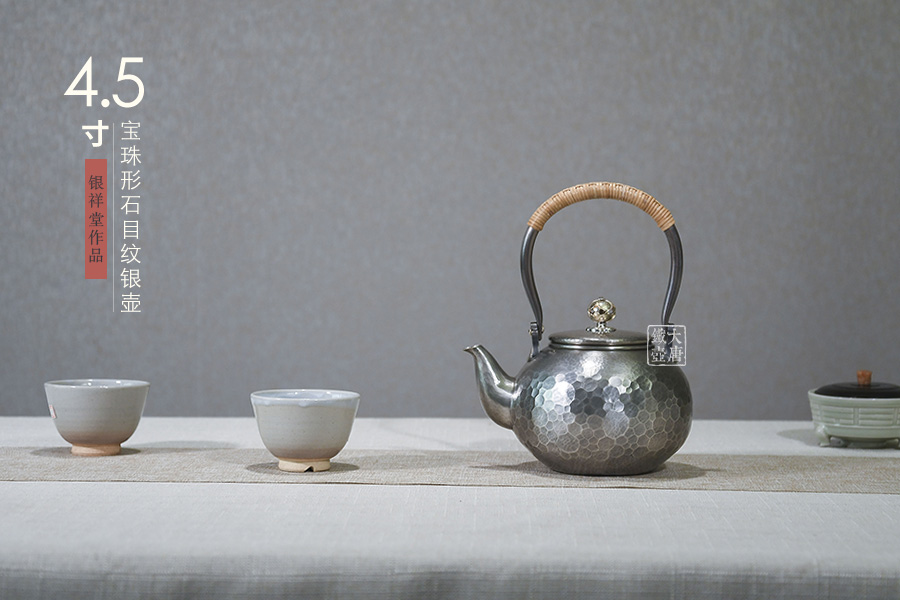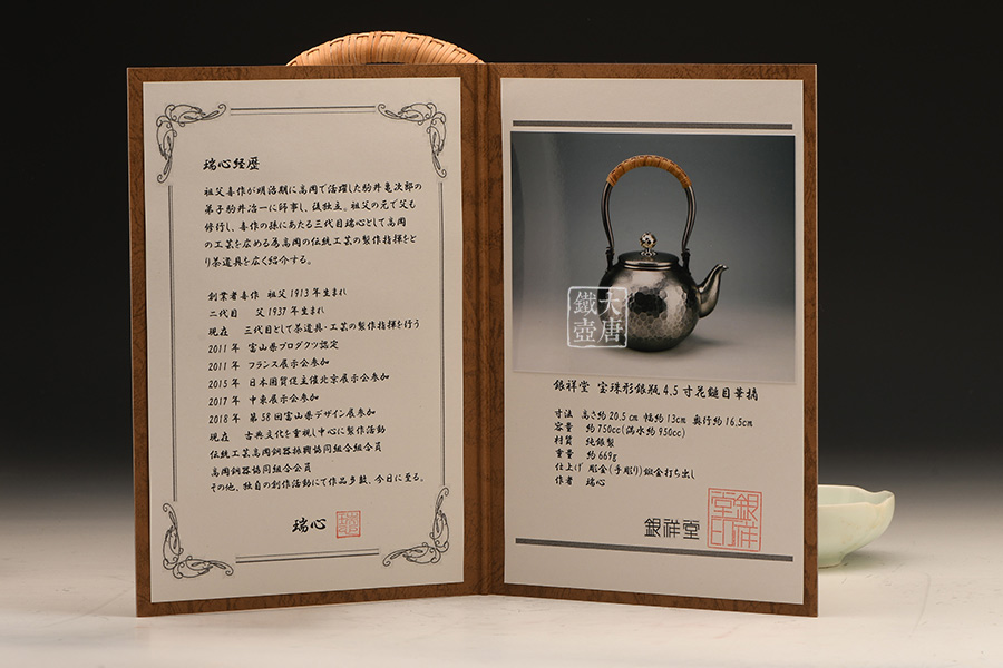 銀祥堂與銀壺名家森川榮月老師曾合作交流設(shè)計(jì)限定款 山·月·鹿銀壺。以及與日展理事,著名雕刻家南部祥云先生合作交流創(chuàng)作了四瑞銀壺。并突破性的制作了耳口出一張打銅壺。