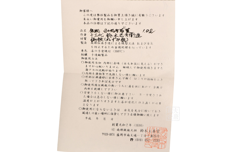 鈴木主善堂位于盛岡南大街,創(chuàng)立于1616年,是盛岡最古老的南部鐵器制造商之一。用代代相傳的鑄造技術(shù)做出來的鐵器倍受歡迎,來自全國的定單絡(luò)繹不絕。近年來又推出新系列的樣式,“要讓簡單實用的鐵瓶表現(xiàn)出美的感覺”12代鈴木傳人一直保持并發(fā)揚著這樣的信念。
