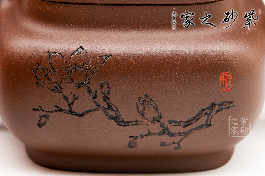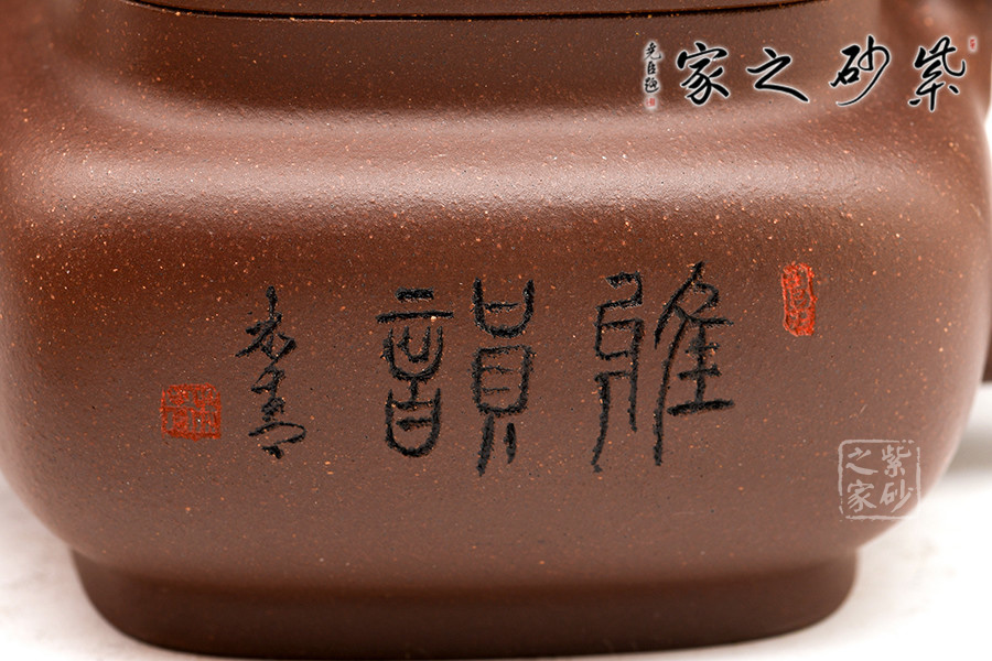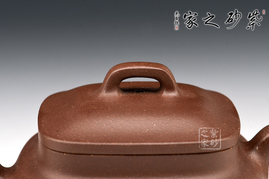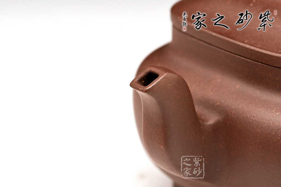 此作壺身的線條感、弧度感都很有特點。器朗神俊、意氣高昂的壺身,呈四方體,鼓腹飽滿,接縫處為圓角處理,渾樸有致。高壺頸,三彎流式胥出,四方壺嘴,弧把昂揚。