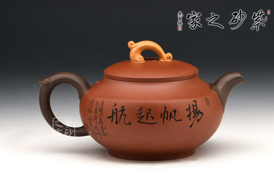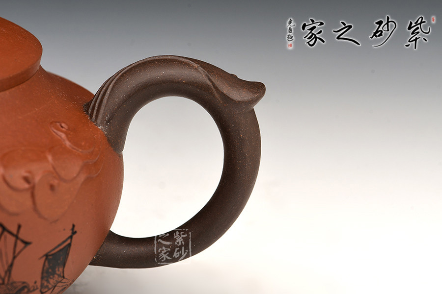 此壺整體型制簡單大方,實用方便,但在細節處處理巧妙,體現在壺鈕,調色設計,呈翻騰的浪花形態,亮眼但不突兀,呼應“揚帆起航”的主題。