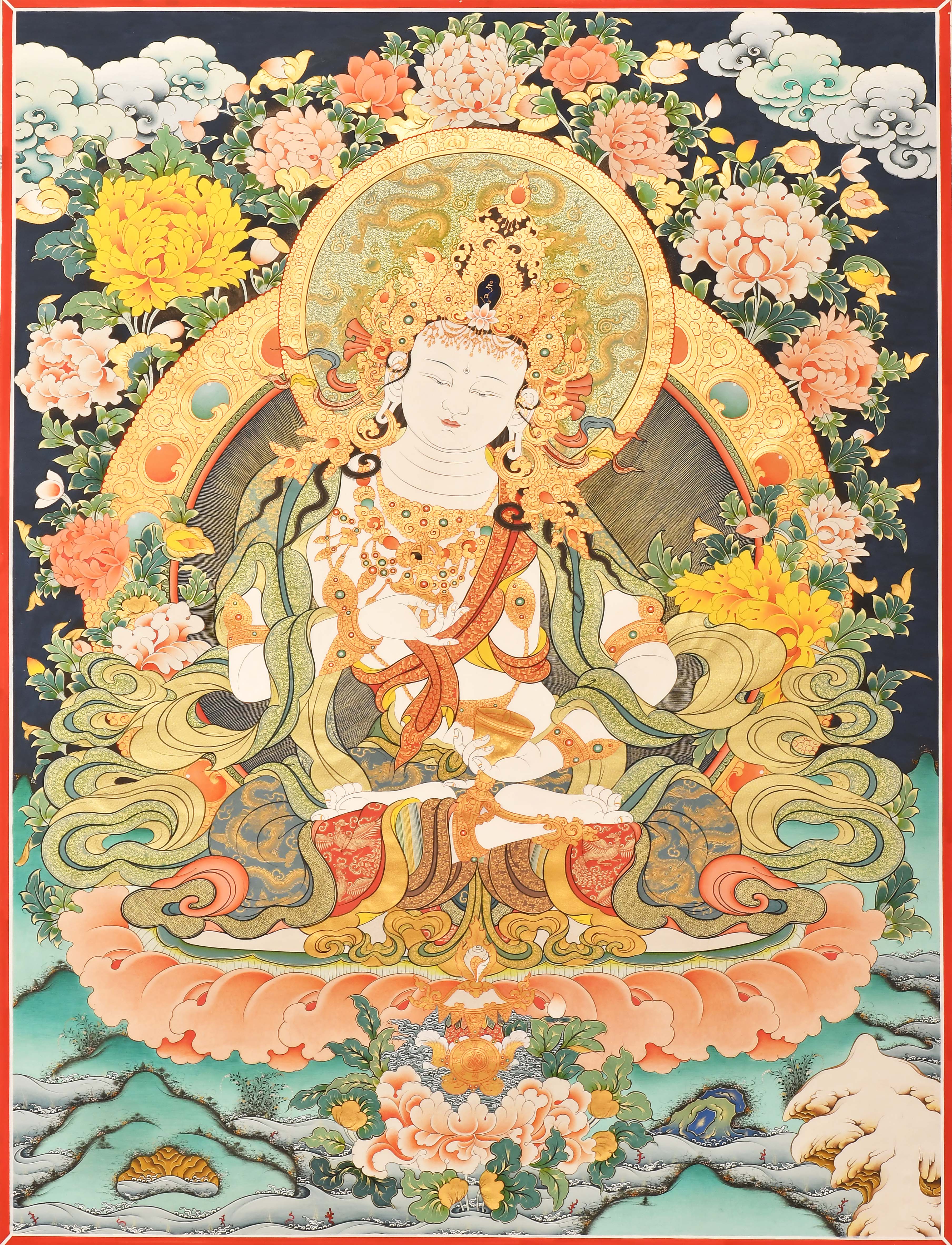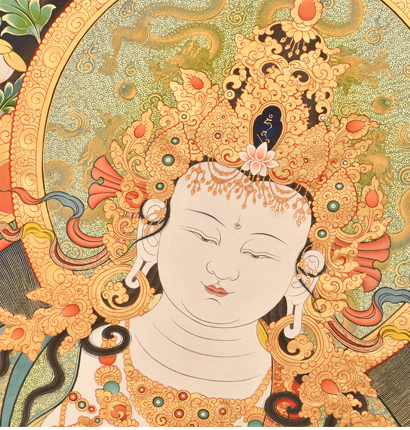 此幅唐卡為青海熱貢唐卡,吾屯下寺出家師父尖措大師繪制,色彩鮮艷明亮,畫工精致細膩。