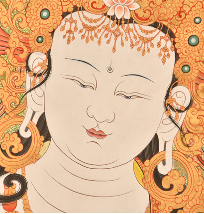 | 唐卡“師傅”開臉,筆路穩重流暢。體現完美天人相,可見佛菩薩慈眉善目,賦予唐卡畫像生的靈氣。 | 細節決定品質,點睛之筆不到位影響整體美觀,五官比例不協調,面目呆板,缺乏靈氣。 |