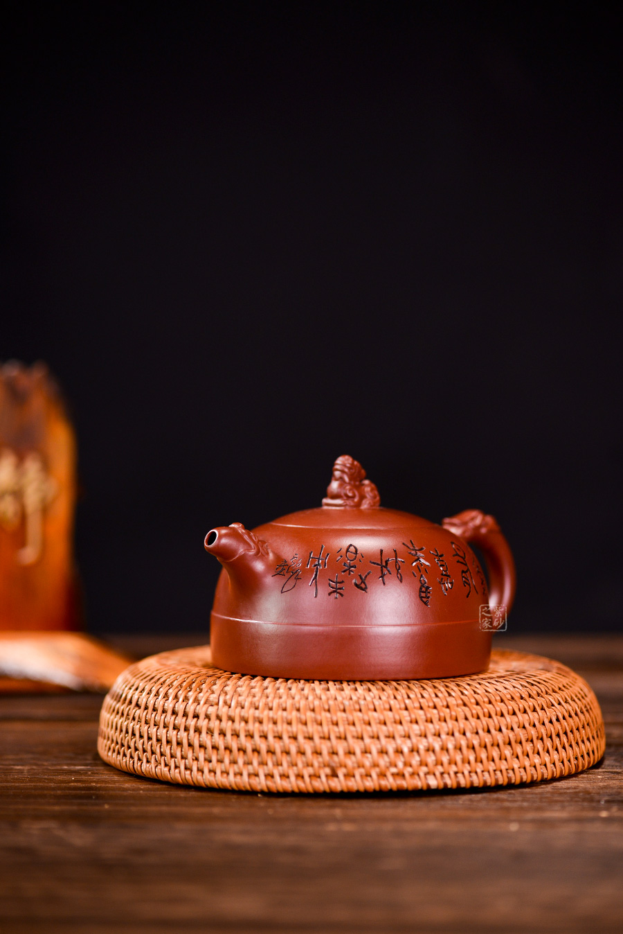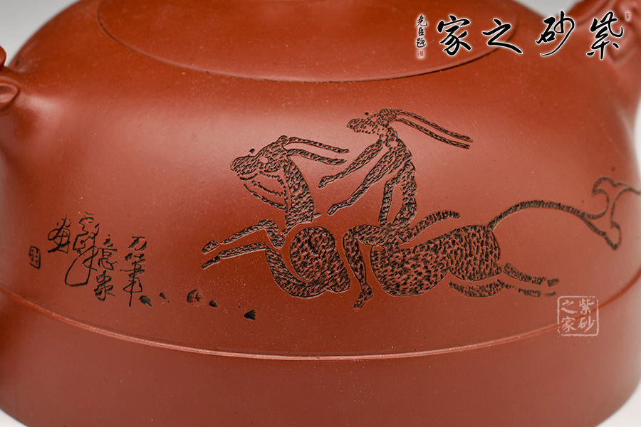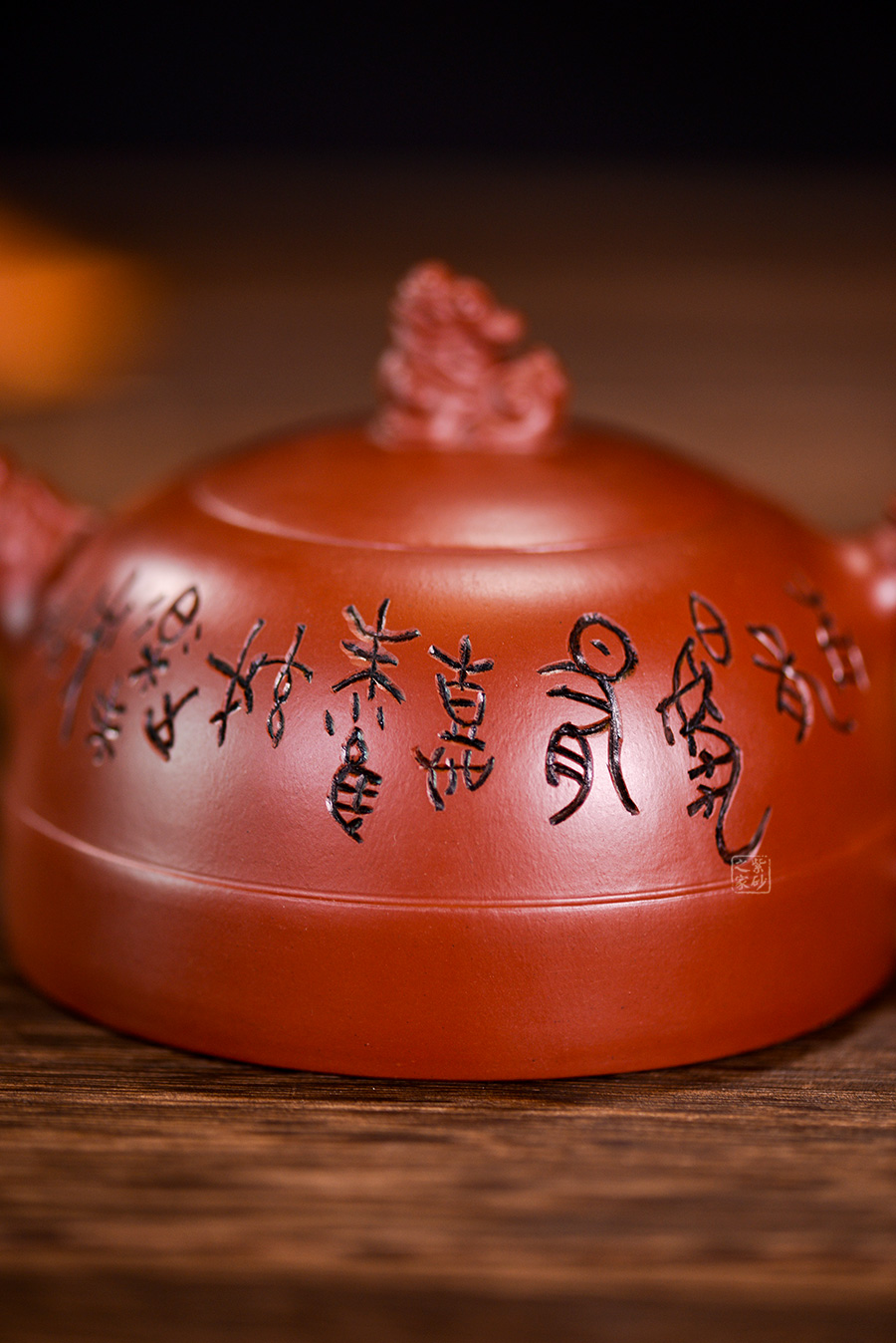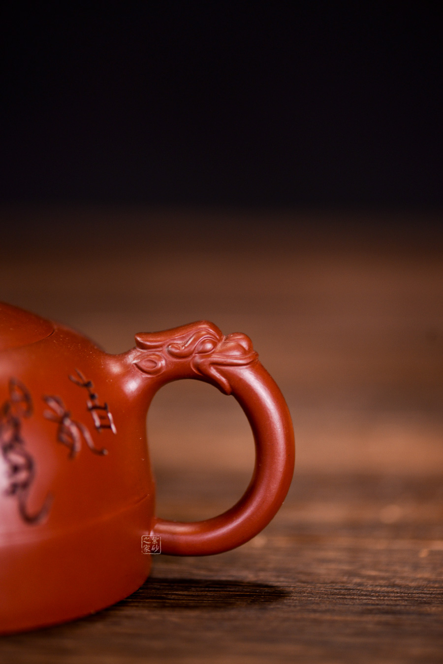 此款壺有著吉祥如意、前程無量的寓意。其壺身飽滿圓潤,壺身上雙面篆刻書畫及陶刻詩詞,蒼勁有力,令此壺在富貴權勢之中添了一些風骨韻節(jié)。