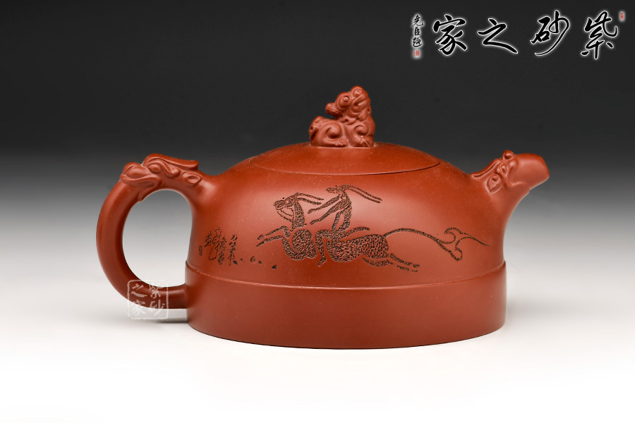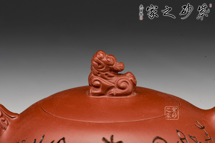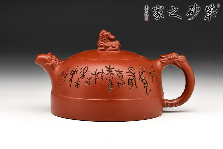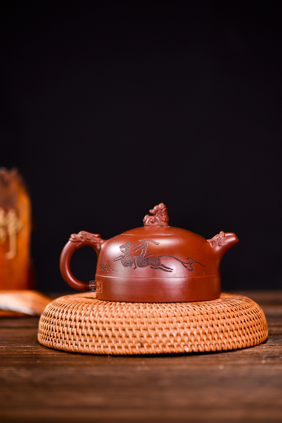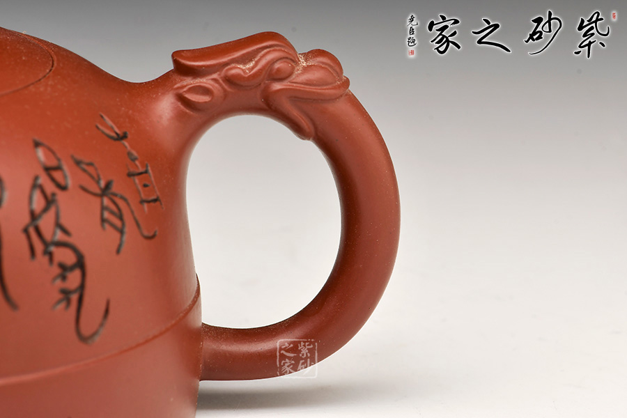 此款壺有著吉祥如意、前程無量的寓意。其壺身飽滿圓潤,壺身上雙面篆刻書畫及陶刻詩詞,蒼勁有力,令此壺在富貴權勢之中添了一些風骨韻節(jié)。