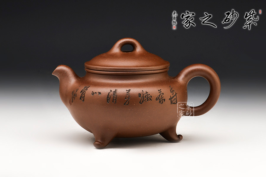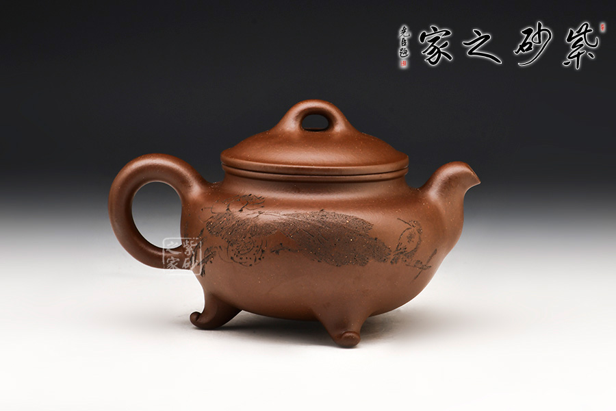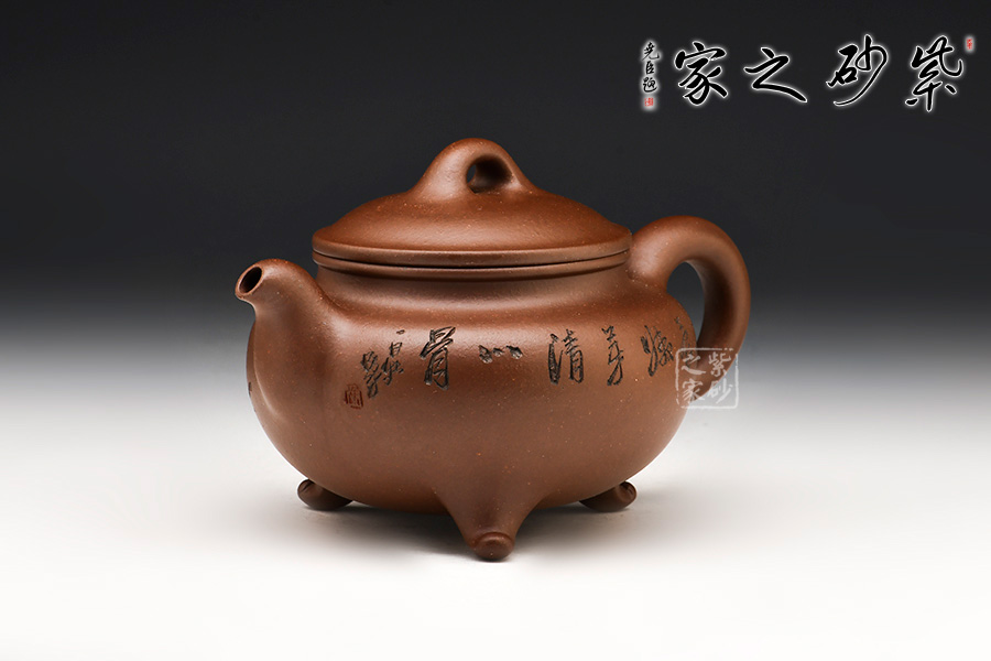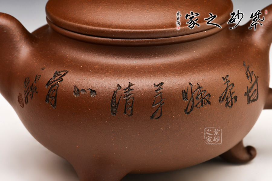 此壺整體壺身為圓形,飽滿挺括,橋型壺鈕,簡(jiǎn)潔有力,蓄勢(shì)待發(fā)。短彎壺流,吉祥雅美。耳形壺把,實(shí)用方便,加之三足作底,散發(fā)出深沉古雅之韻味。