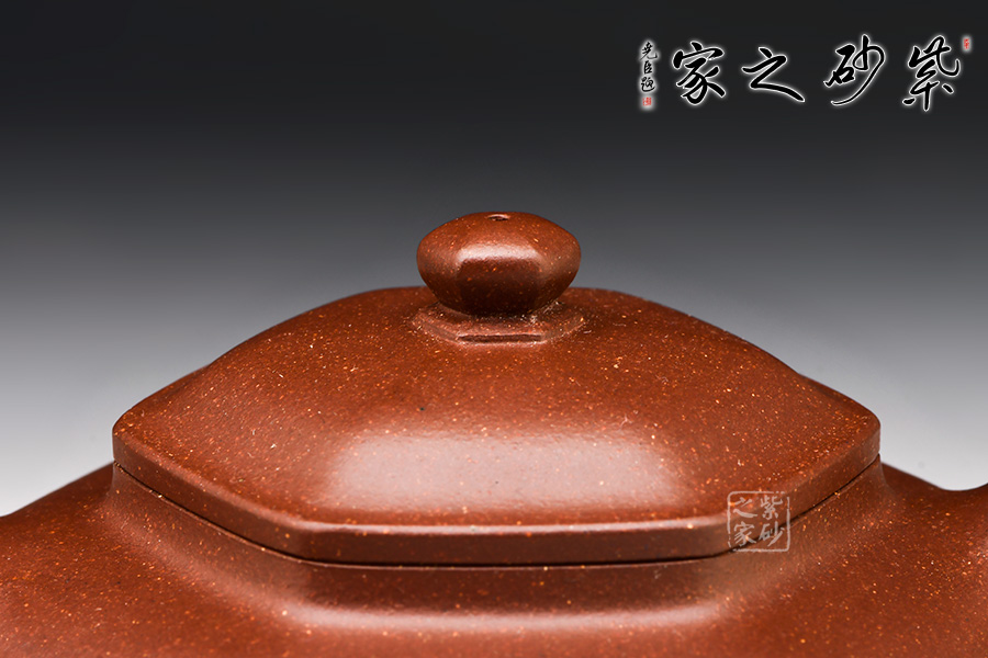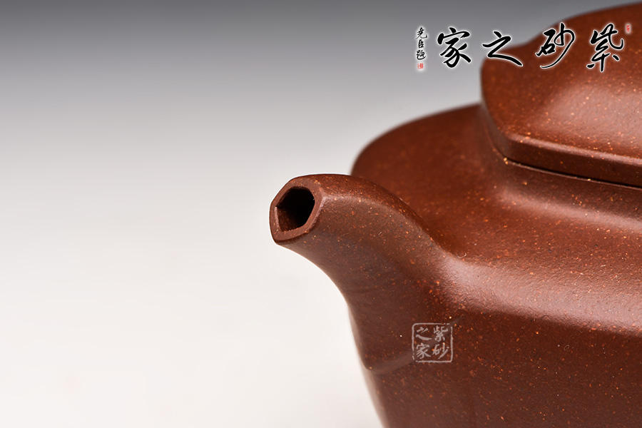 此壺為方器造型,方中藏圓。壺身與壺蓋緊密相連,而六方轉(zhuǎn)動(dòng)皆吻合。壺鈕與壺身相呼應(yīng),采用六方圓體造型,使紫砂壺的造型更加生動(dòng)、形象、活潑。