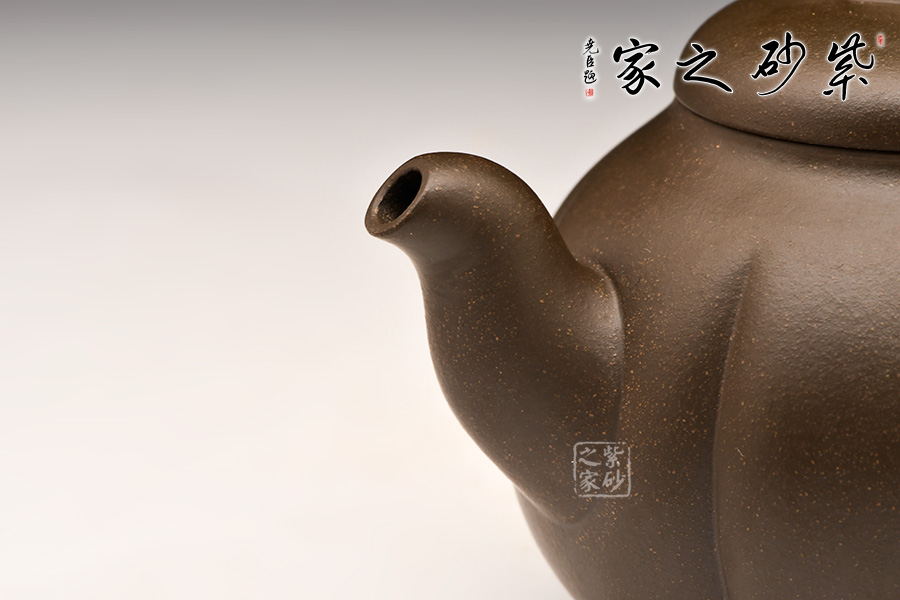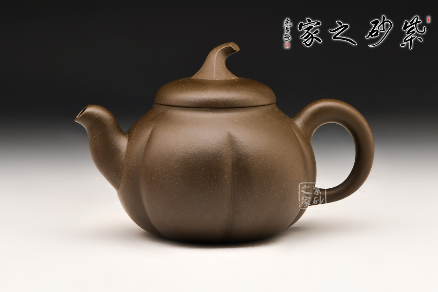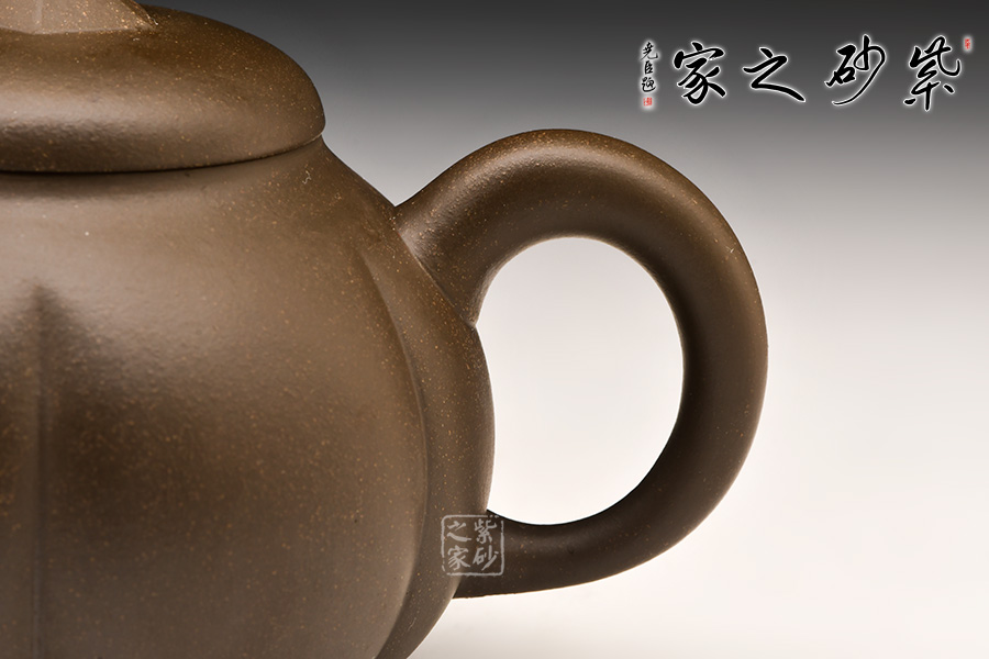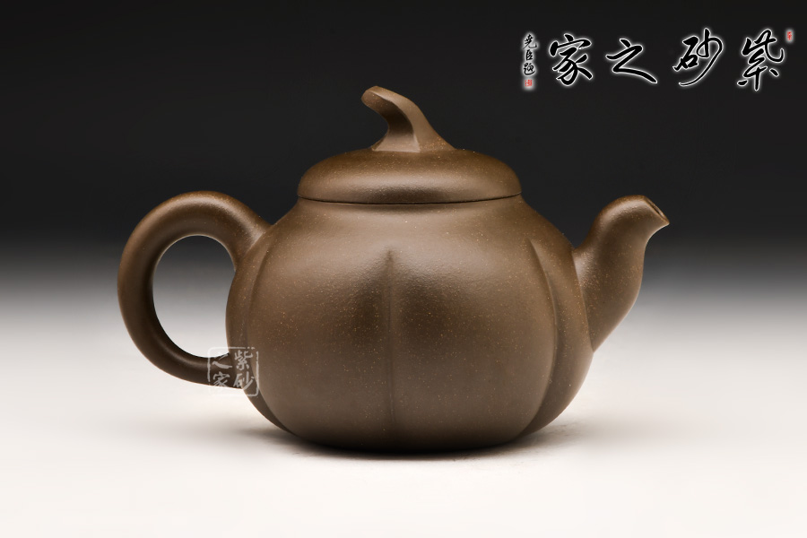 此壺整體色澤古樸,形態(tài)逼真,饒有趣味。壺身圓融作筋紋狀,取南瓜之型。為六瓣依次圓弧起伏,別有韻味。