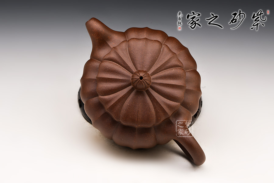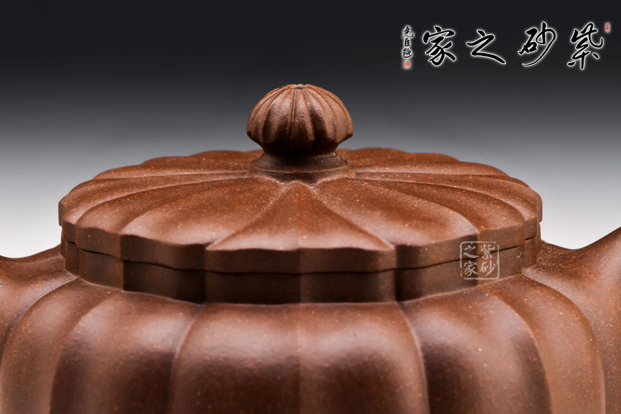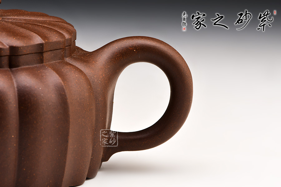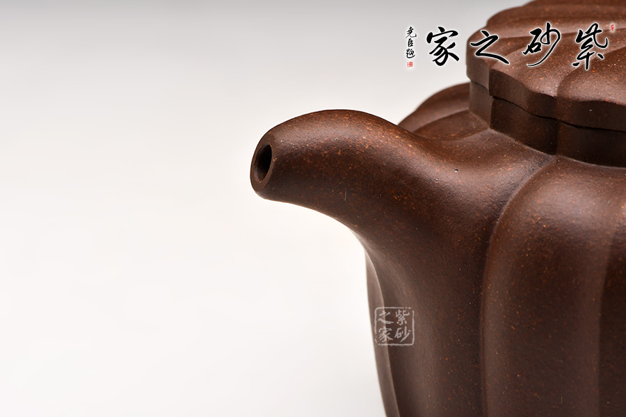 古樸穩(wěn)重,玉器質感,肅穆靈秀。菱花瓣自壺鈕至壺身盈盈綻放,筋紋盈收得宜,觀賞性極為強烈。