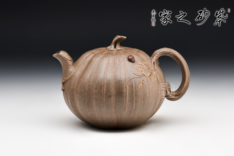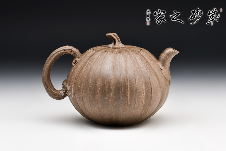 顧云峰所制香玉壺,形似南瓜,以青段為料,色澤古樸,使南瓜形象更加逼真,活靈活現(xiàn)。壺身遍布南瓜紋理,腹部圓鼓,向上、下漸收斂。流似卷狀瓜葉,柄如隨意彎扭瓜蔓,長(zhǎng)出瓜葉貼飾壺身,脈葉經(jīng)絡(luò)清晰可見,足見作者心之細(xì)膩,手之靈巧。嵌蓋取自壺身,與壺身相交嚴(yán)絲合縫;瓜蒂做鈕,經(jīng)典靈巧。