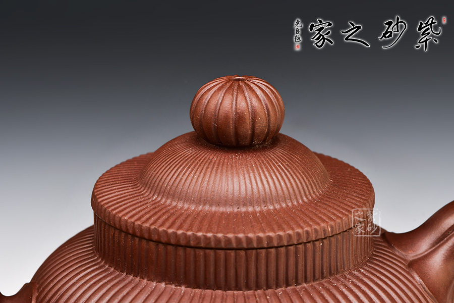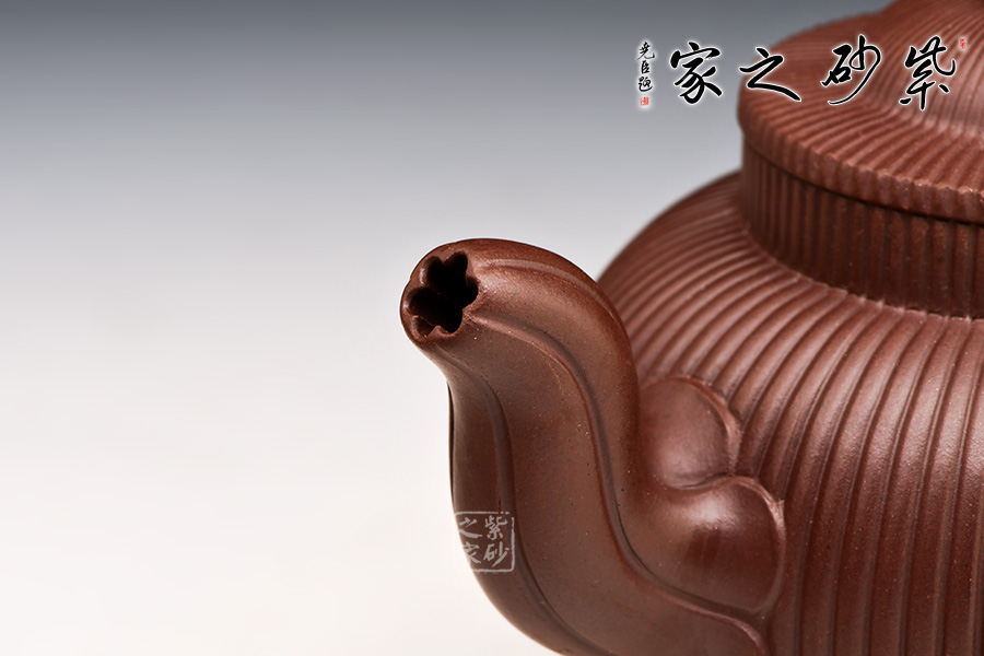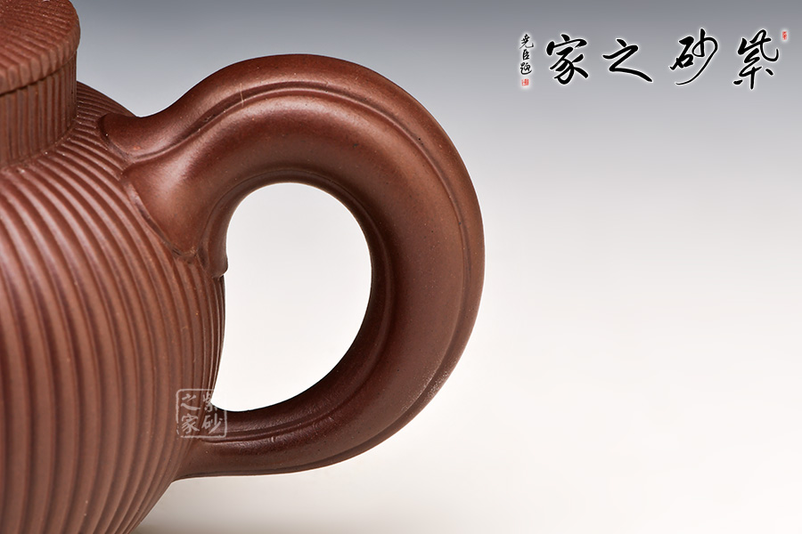 壺身和壺鈕均為球體,圓潤而高聳,猶如兩顆飽滿的果實,蘊藏著厚重的內(nèi)涵。鈕、蓋和壺身均有筋紋裝飾,線條舒展,過渡平穩(wěn),手法干凈利落,三彎流胥出自然,耳形把拿握趁手,整器端莊古雅,工藝卓絕,制作不易,十分難得!