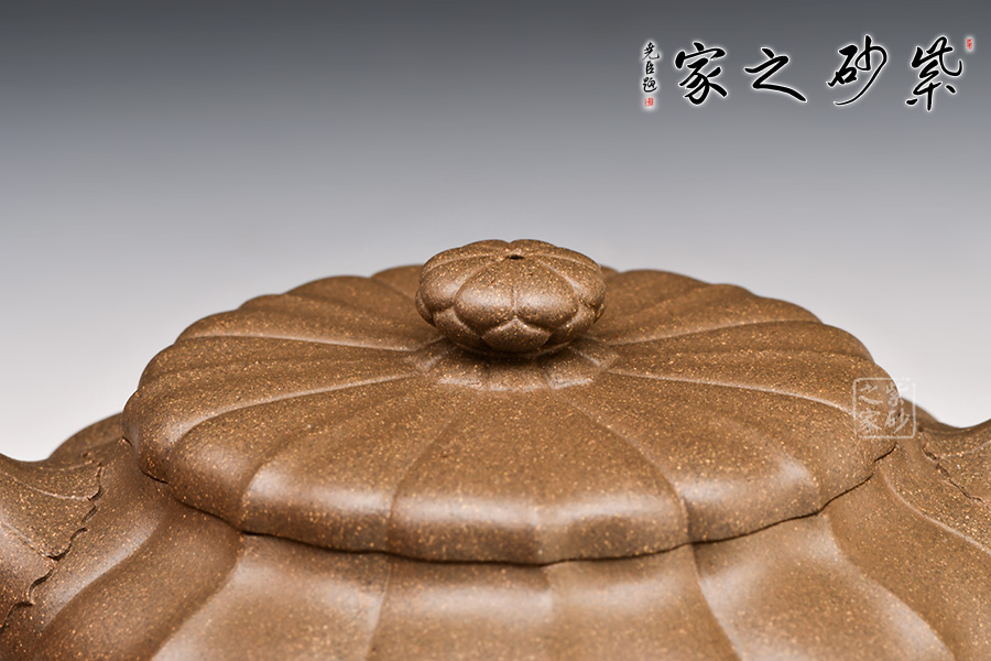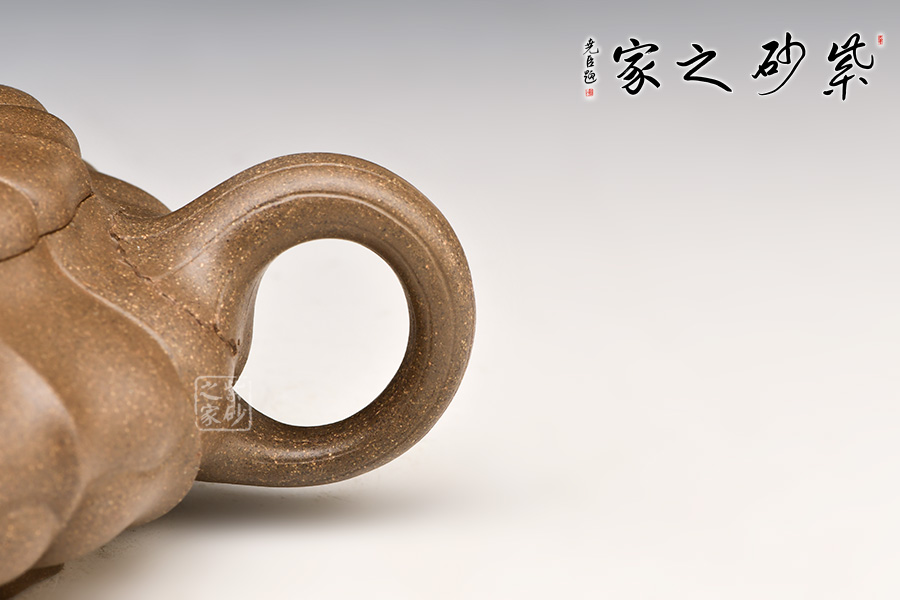 此壺壺身較扁,但扁而不塌,行話有“造型扁一分,成型難一分”,可見作者工藝之精湛。壺身筋紋分布均勻,上下線條完美吻合,仿若一蹴而就,壺口與壺蓋嚴(yán)絲合縫,仿若一體,一彎流似貼于壺身,與耳形把對(duì)應(yīng)稱勢(shì),整壺在筋紋中追求虛扁的傳統(tǒng)韻味,施藝嚴(yán)謹(jǐn),制作精良,既實(shí)用有有收藏價(jià)值!