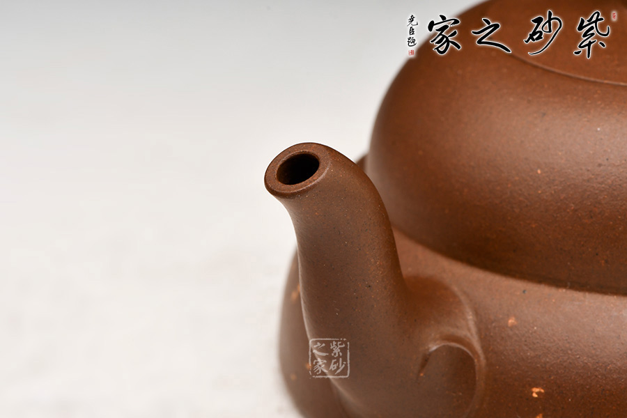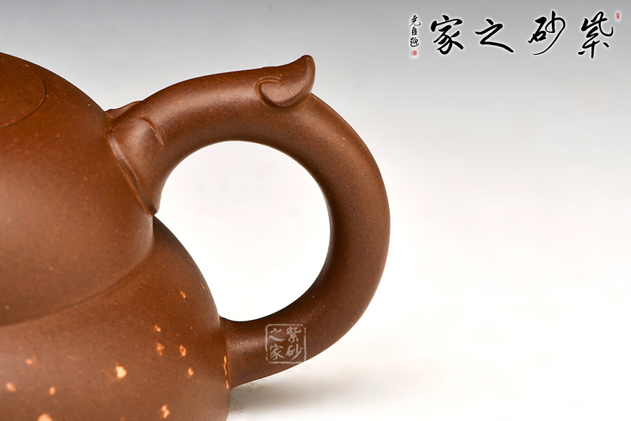 嵌蓋緊實,嚴絲合縫;圓直壺鈕,似帶“戒指”。三彎流修長胥出,方圓并濟,耳形把氣勢十足,與壺嘴遙相呼應,精準優(yōu)美。壺身下部作鋪砂裝飾,“金光”點點,更添藝術氣息。