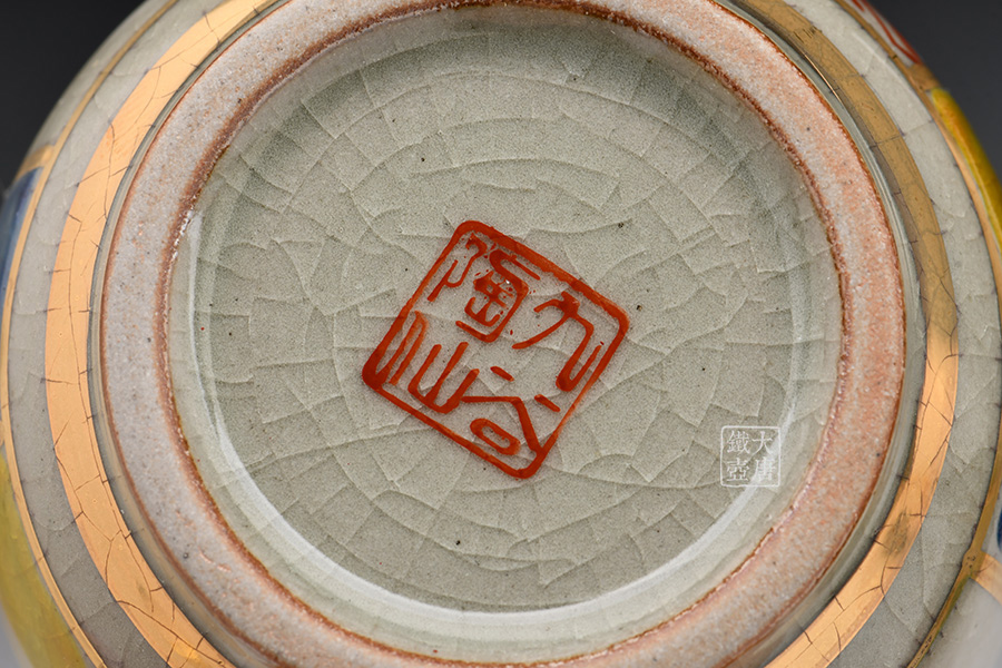 “九谷燒”取名于“九谷村”,并且這個時期制造的陶瓷被稱為“古九谷”。它是繼承自傳統的修養的正規武士們藩、里的畫匠們、還有就是后藤才次郎從長崎領來的朝鮮以及明朝的技術者、和有田的陶瓷工人們等同心協力制陶的智慧精華于一身。“九谷燒”的獨特風格,是它的繪畫線條豪放、明快,顏色有綠、黃、紅、紫、藏青色等五種。九谷燒經過采石、粉碎、篩籮、沉淀、成形、烘烤、素燒、繪畫、施釉、燒制、彩繪后再燒制等十幾道工序完成。古九谷燒瓷質溫潤,配色強烈,運用紅、黃、綠、紫、青等五種顏色,大膽構圖,線條自然流暢有力,形成豪放,秀麗,奢華的高品位獨特風格。