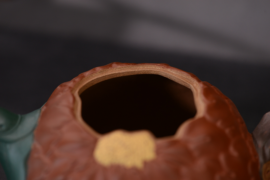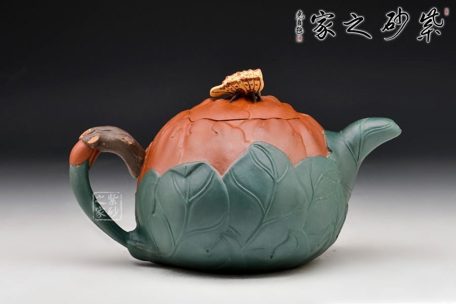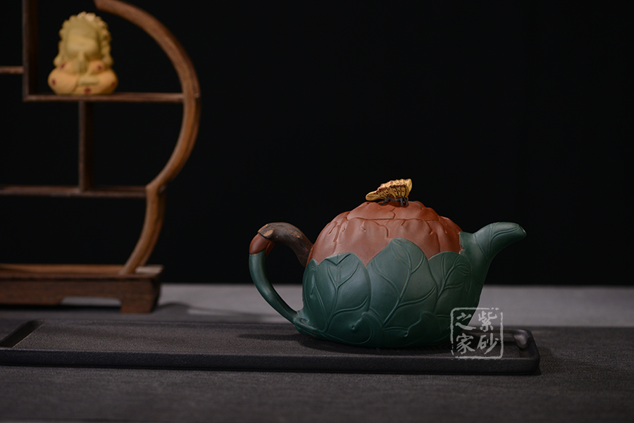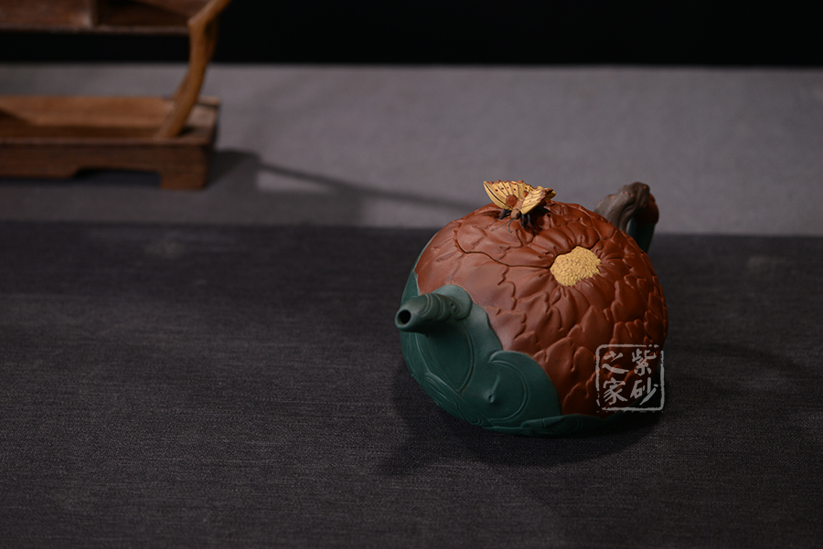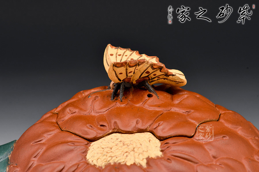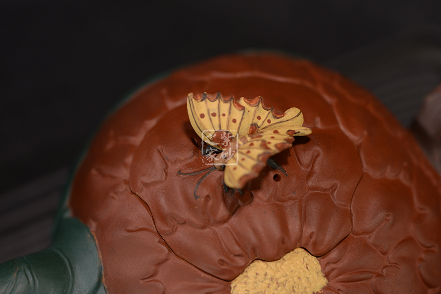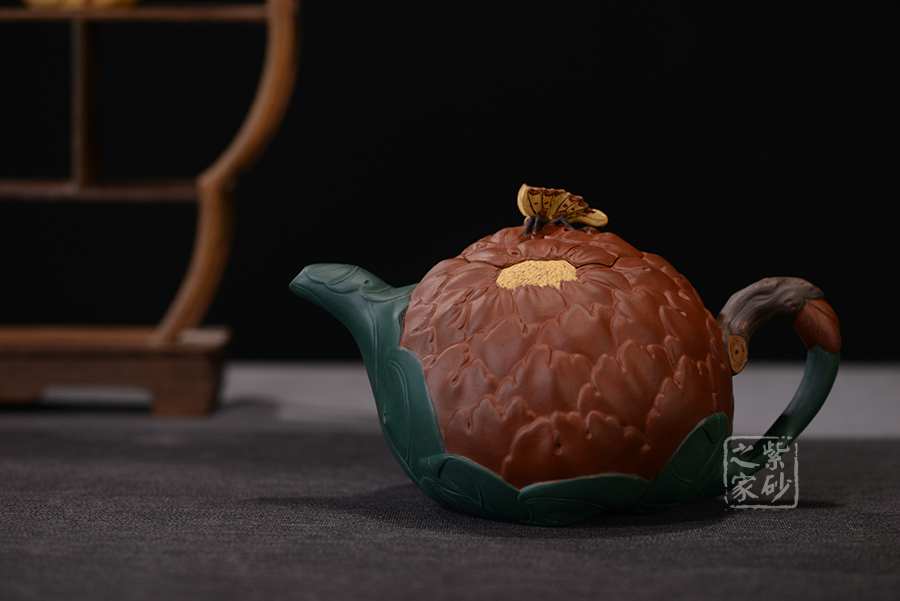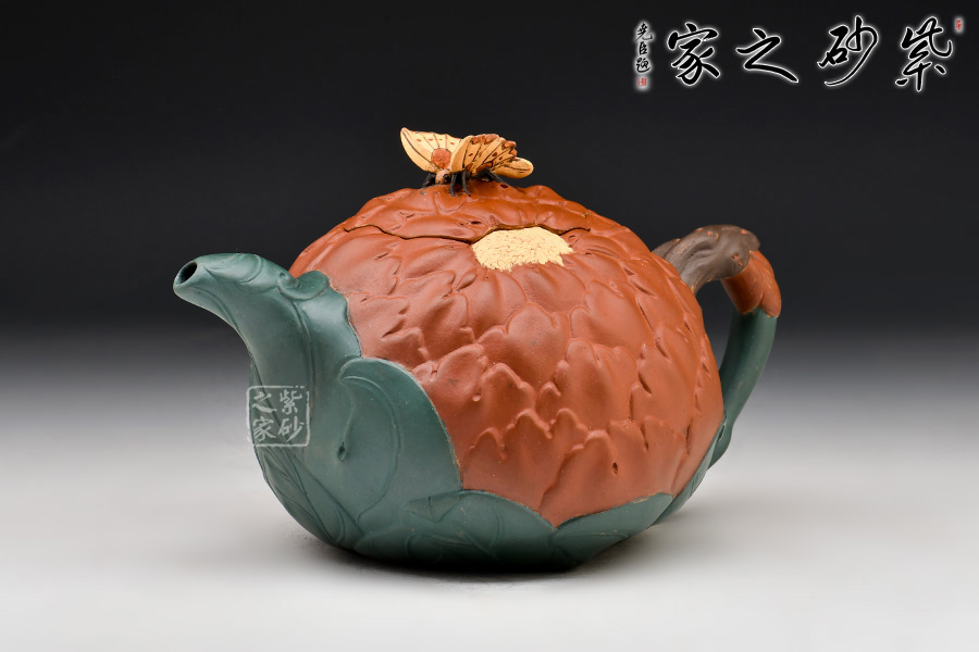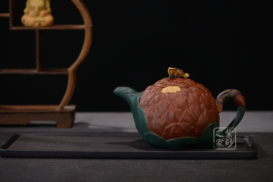 牡丹乃眾花之王,該款紫砂壺的形狀以含羞待放的牡丹花為元素。壺的色彩十分艷麗,似綻放的牡丹花。在整器制作的過程中,運用了多種紫砂壺制作工藝,特別是泥塑的運用,將大紅泥、蛋黃泥等色泥精心地配合而制成。以牡丹花瓣為壺身,上百片花瓣呈紫紅色,又把綠葉卷成壺嘴,壺身底中部用綠葉裝飾點綴,花瓣正中為粉紅色花蕊。一只彩蝶點綴在壺蓋上,如神來之筆,使裝飾物悠然成趣,作品生動可愛。