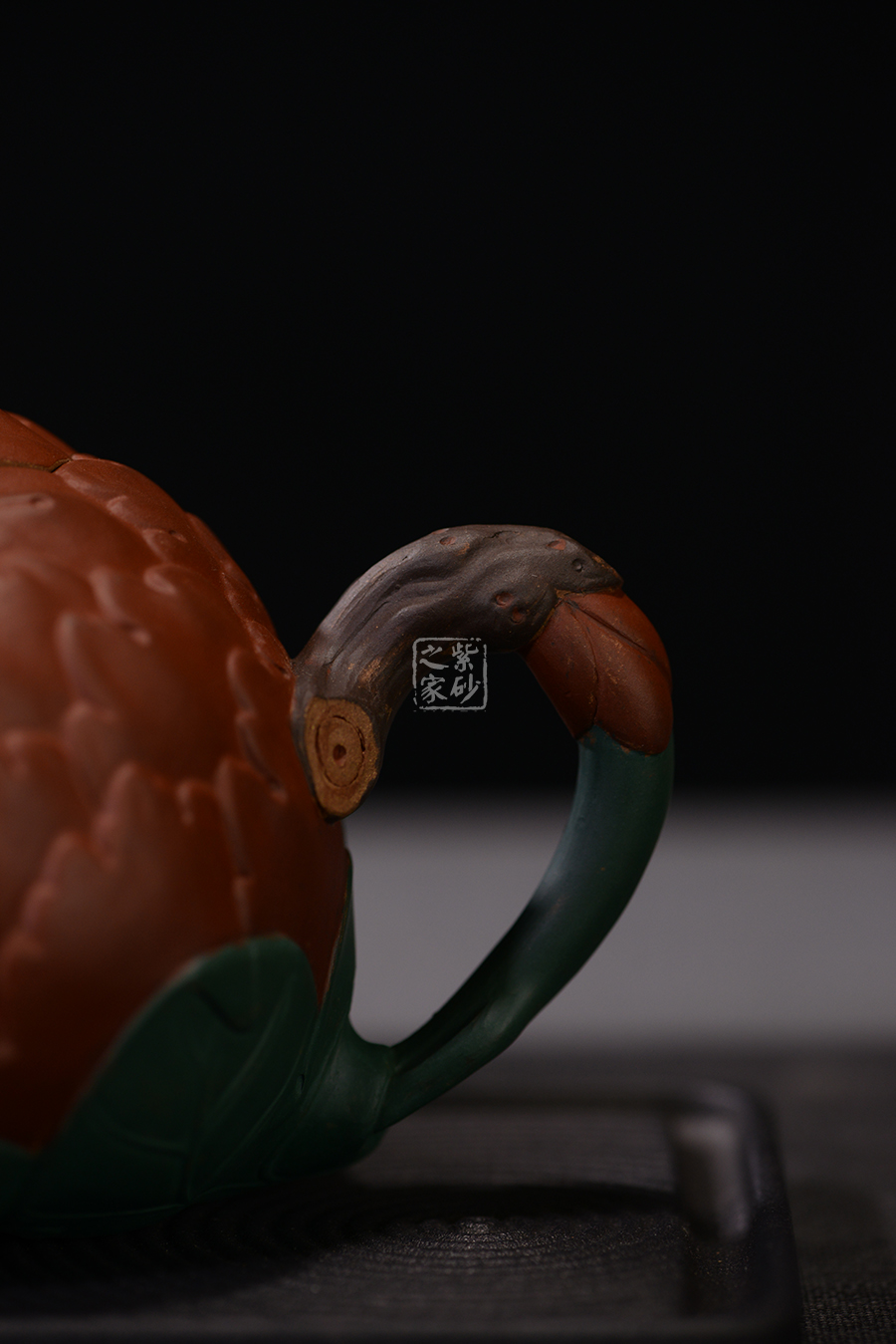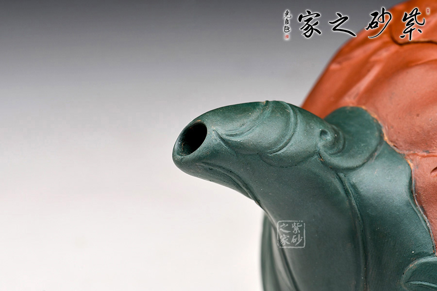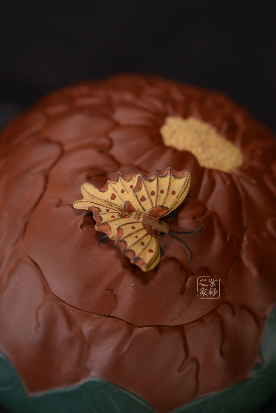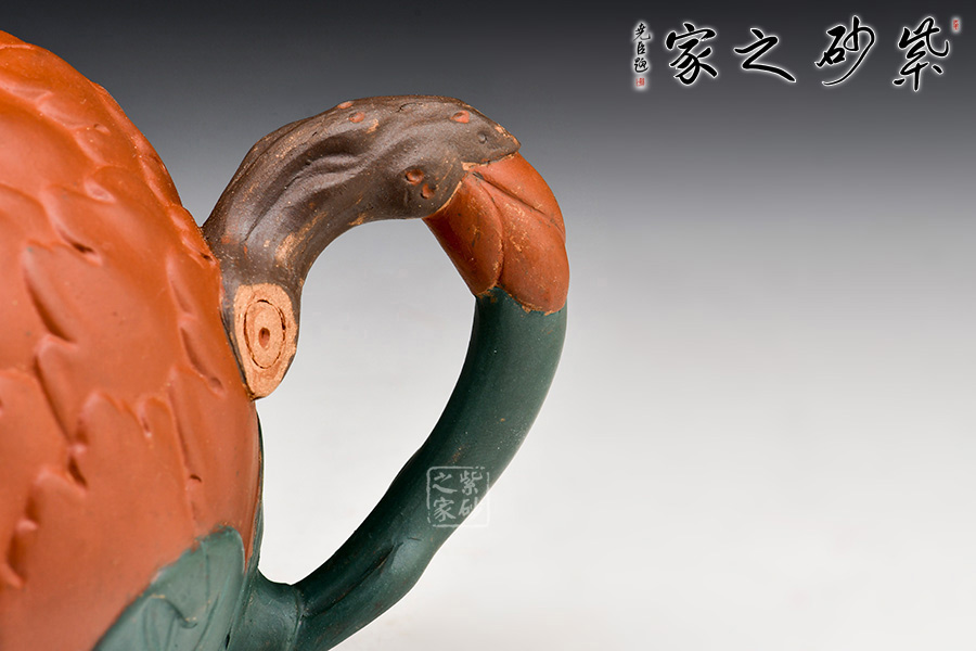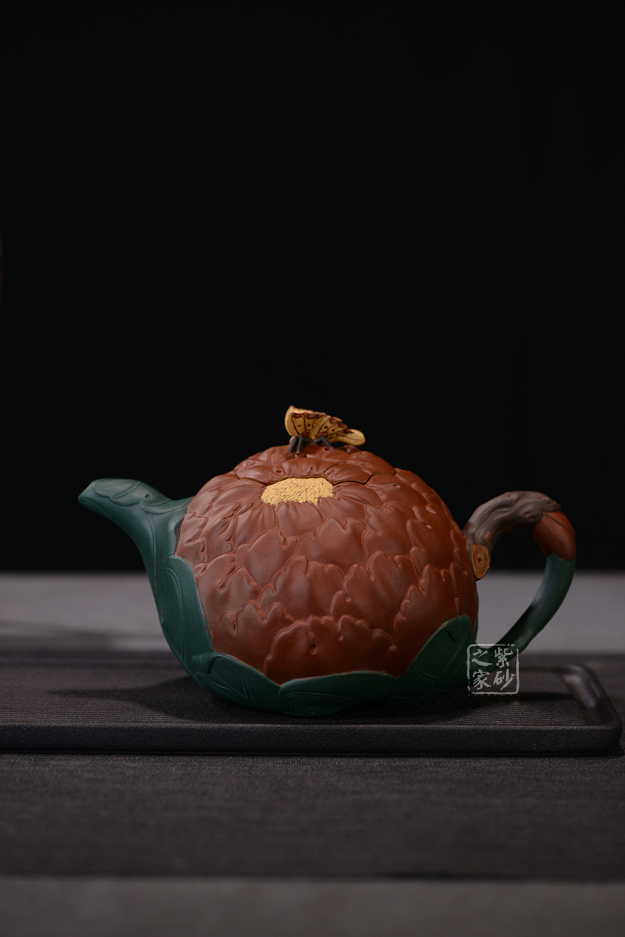 牡丹乃眾花之王,該款紫砂壺的形狀以含羞待放的牡丹花為元素。壺的色彩十分艷麗,似綻放的牡丹花。在整器制作的過程中,運用了多種紫砂壺制作工藝,特別是泥塑的運用,將大紅泥、蛋黃泥等色泥精心地配合而制成。以牡丹花瓣為壺身,上百片花瓣呈紫紅色,又把綠葉卷成壺嘴,壺身底中部用綠葉裝飾點綴,花瓣正中為粉紅色花蕊。一只彩蝶點綴在壺蓋上,如神來之筆,使裝飾物悠然成趣,作品生動可愛。