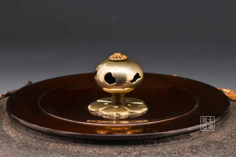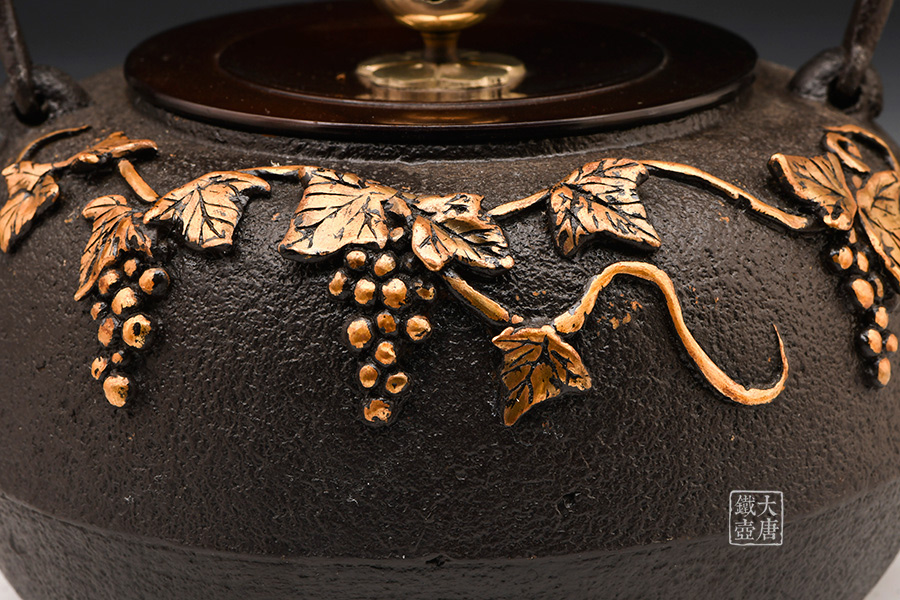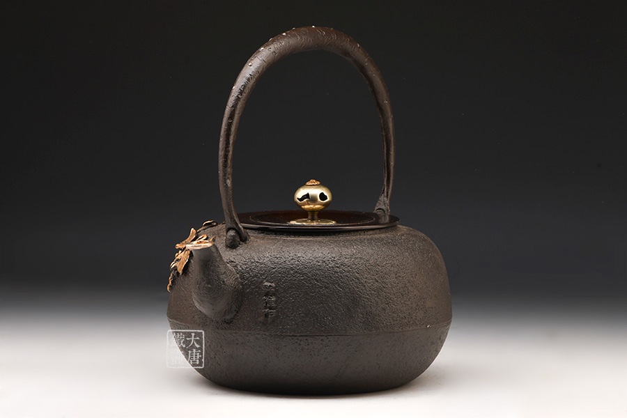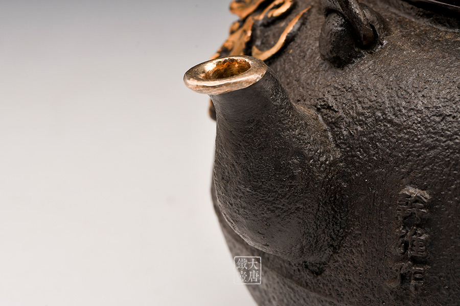荒井工房的鐵瓶除了在鑄造工藝上有嚴格的規(guī)范和體系,在鐵瓶裝飾技術上也頗有建樹。除了傳統(tǒng)的印刻技術外,荒井工房還掌握了非常出色的金銀鑲嵌技藝,尤其以大片的鏨刻銀片最為出眾,這在山形當地堂口中獨樹一幟。
